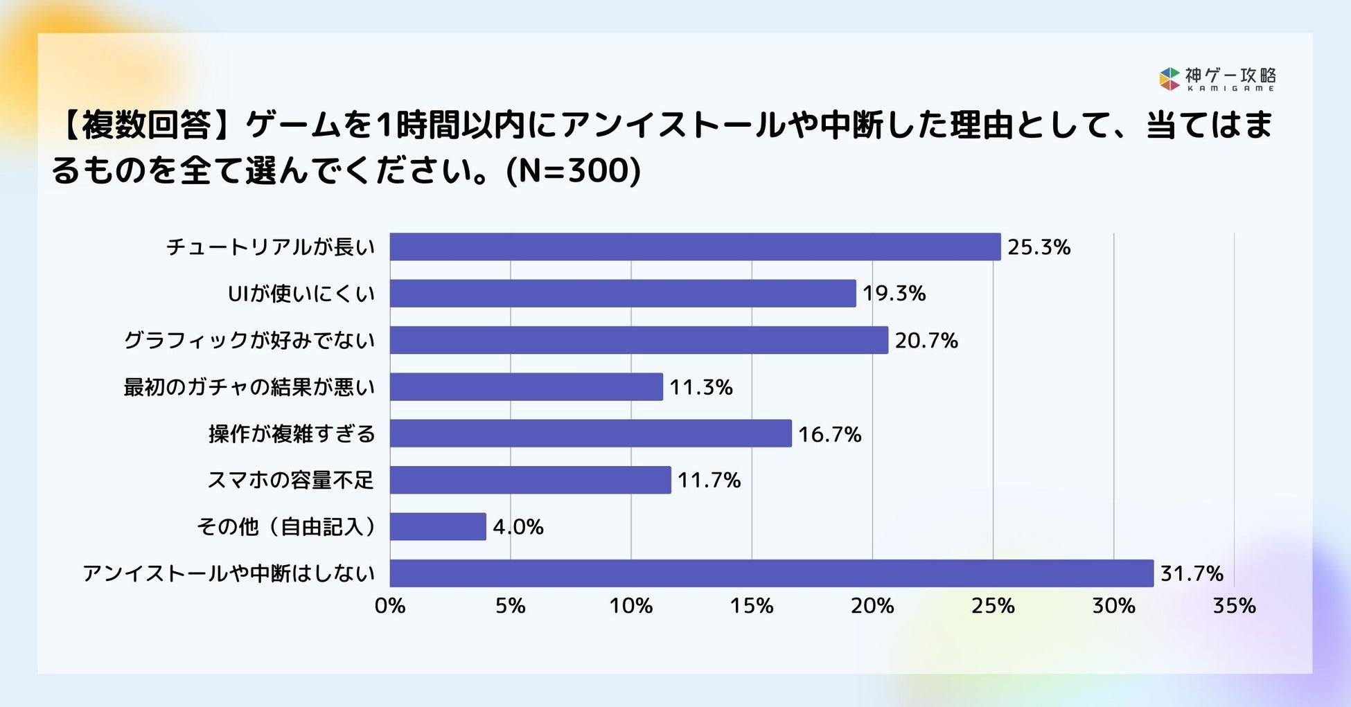 ゲームを1時間以内にやめた理由では「チュートリアルが長い(25.3%)」が最多でした。