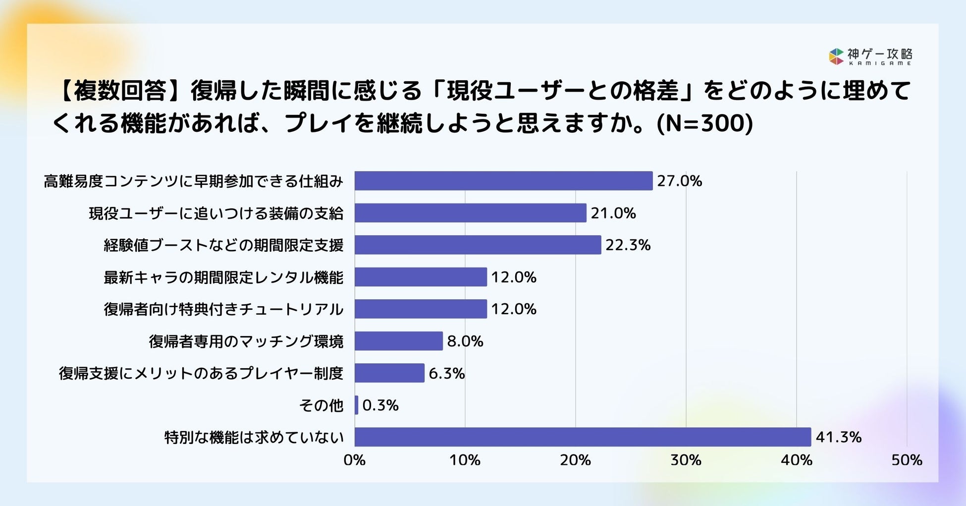 復帰後に求める機能では「高難易度コンテンツに一気に到達できる権利(27.0%)」が最多でした。