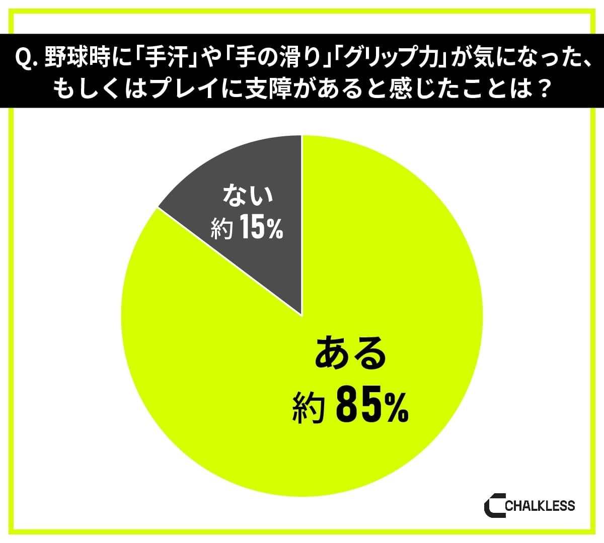 野球の最中に手汗や滑り、グリップ力が気になったことがある人は約85%と、かなり高い割合で気になっていることがわかりました。