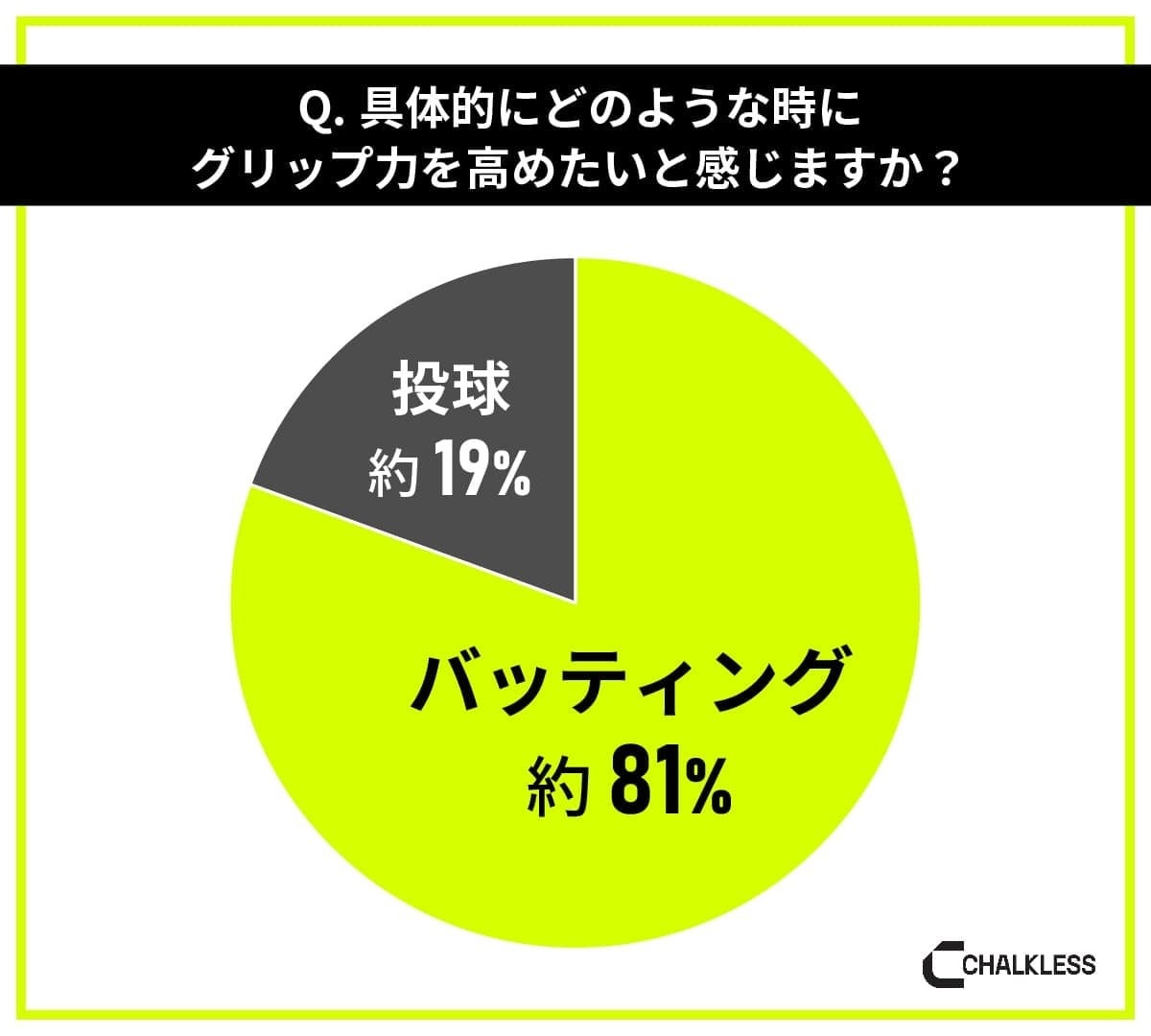 野球経験者の中でグリップ力や滑りにくさを高めたいと感じるシーンとしてバッティングと答えた人が約81%いました。