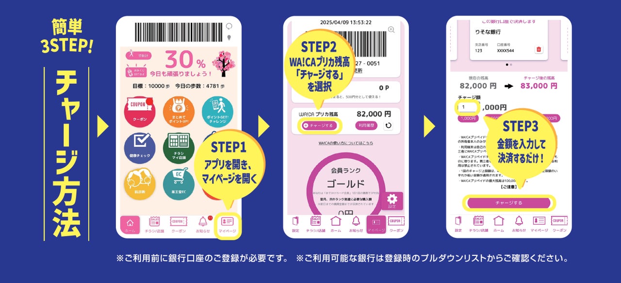 本サービスでは、お手持ちのスマートフォンからいつでも簡単にWA!CAへチャージ(銀行口座から入金)することが可能になります。これにより店頭でチャージする手間が省け、お買い物をよりスムーズにお楽しみいただけます。また、店頭でのチャージと同様に、チャージ金額に応じてボーナスポイントが付与されます。これまで以上に便利でお得になるWA!CAでのお買い物体験をお楽しみ下さい。