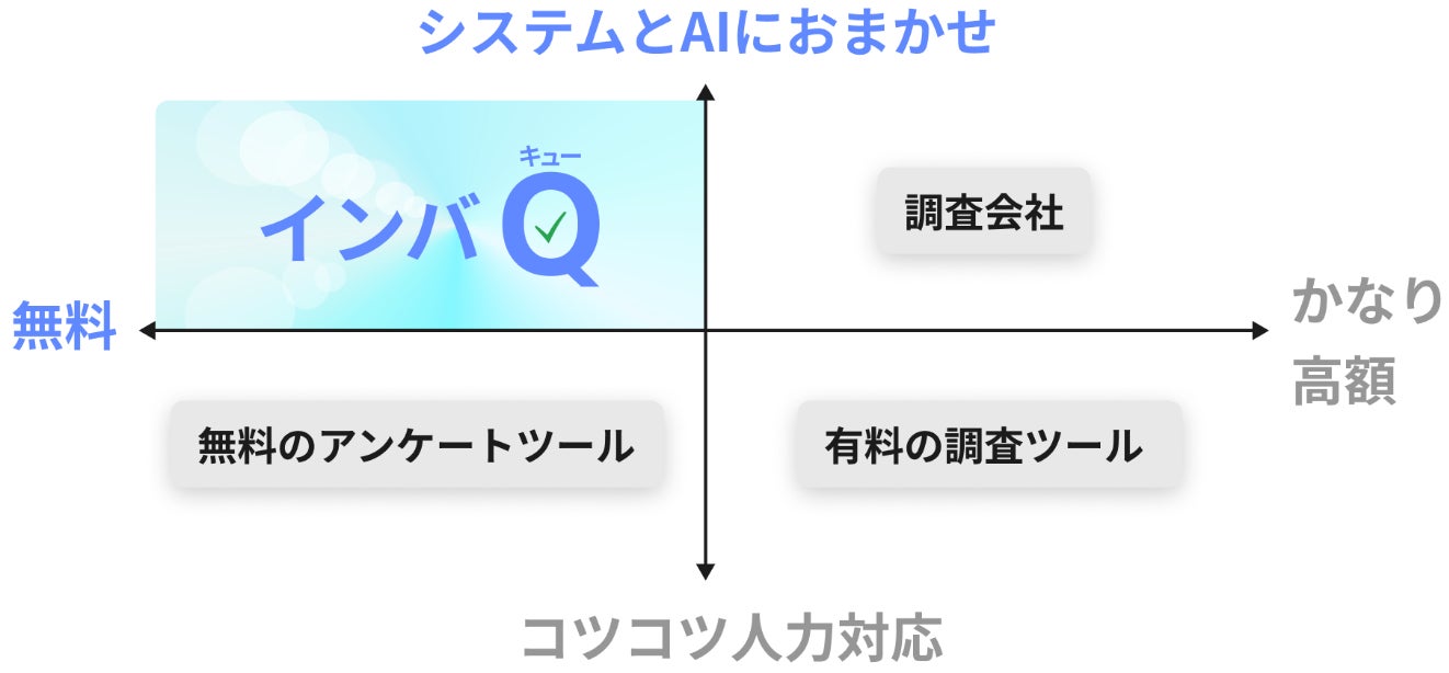 インバQは、専門的なマーケティング調査の領域で従来は両立が難しかった「無料で導入しやすいこと」と「システムとAIによる省力化」の二つを同時に満たす価値ポジションを実現しています。高額な専門調査に頼らなくても、システムとAIが設問設計から翻訳、分析までをサポートしスタッフの手間を最小化します。一般的な無料ツールでは実現できなかった、インバウンド対応や改善アクションの抽出まで一気通貫で行えます。
