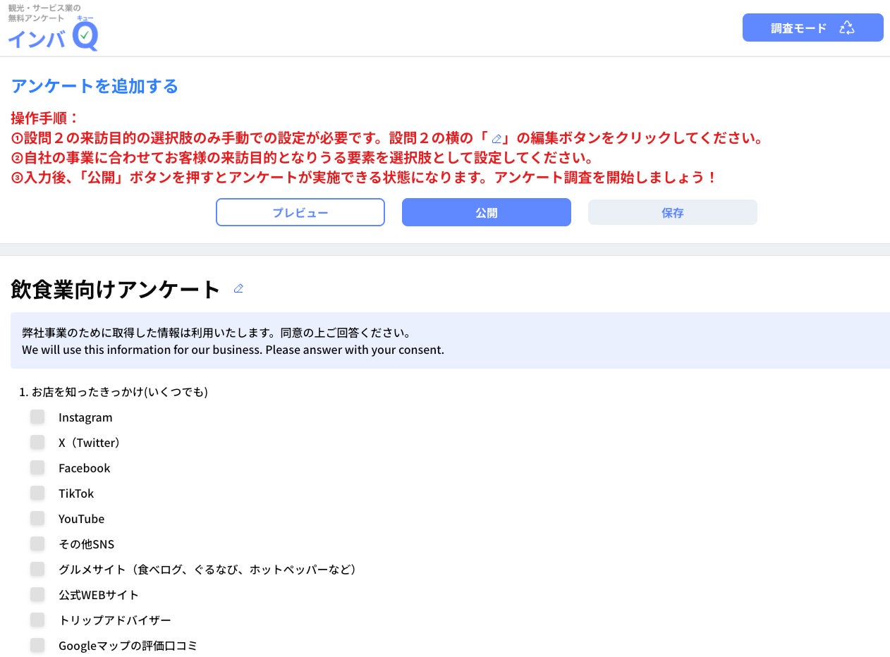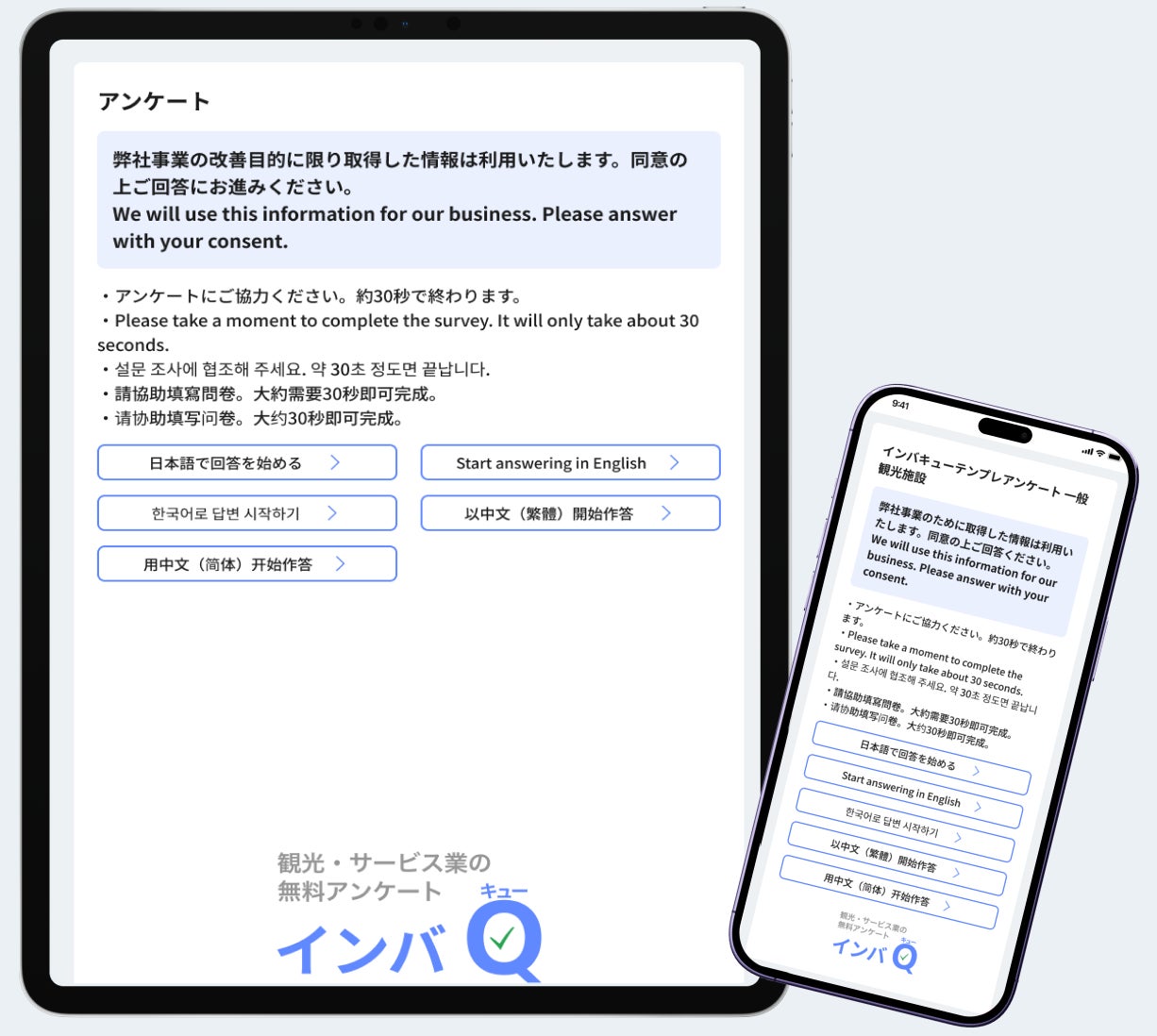 インバQは、こうした課題を解決するために、調査の知見とシステム・AIを活用し、無料プランから利用可能なアンケート作成・集計サービスを提供します。5言語に対応し、国内外の来訪者の声を正確に可視化。2030年に6,000万人のインバウンド(訪日外国人観光客)を目指す「観光立国・日本」の実現を、地域・中小事業者から支援します。