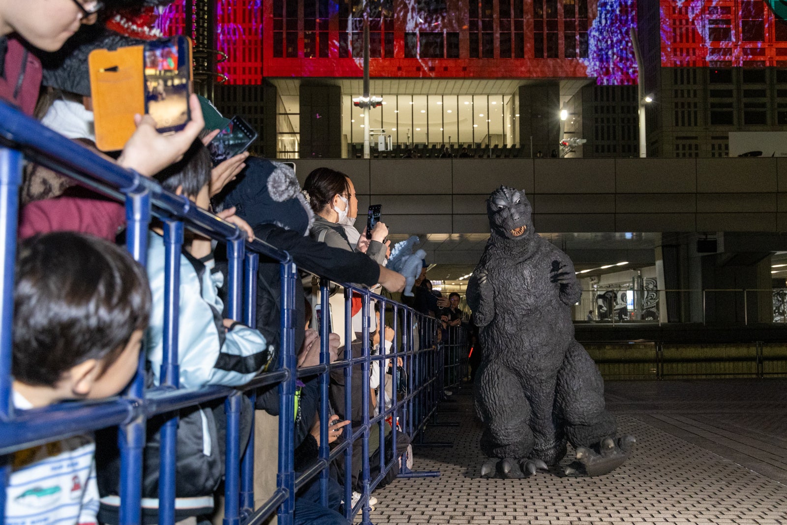 上映初日には、都民広場に初代ゴジラが登場し、訪れた多くの方とともに、初回上映のカウントダウンを行いました。国内外の観光客やゴジラファンなど多くの観覧者が訪れ、人気コンテンツならではの盛り上がりを見せていました。
