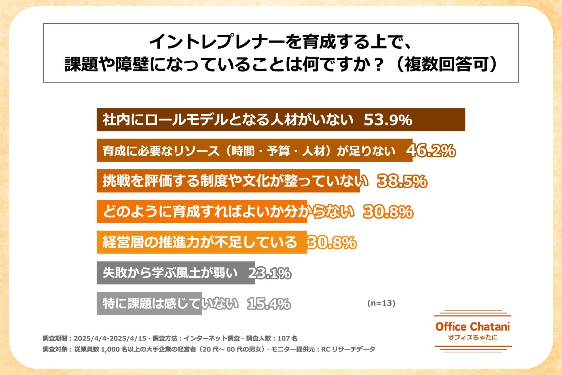 調査の最後、社内に「イントレプレナー」と呼べるような人材が存在しないものの、イントレプレナーの育成に向けた取り組みを行っていると回答された方に「イントレプレナーを育成する上で、課題や障壁になっていること」を尋ねる設問への回答では、1位が「社内にロールモデルとなる人材がいない」で53.9%、2位が「育成に必要なリソース(時間・予算・人材)が足りない」で46.2%、3位が「挑戦を評価する制度や文化が整っていない」で38.5%という結果になりました。この結果から、社内にロールモデルとなる人材がいないことを課題と感じている経営者が多いことがわかりました。