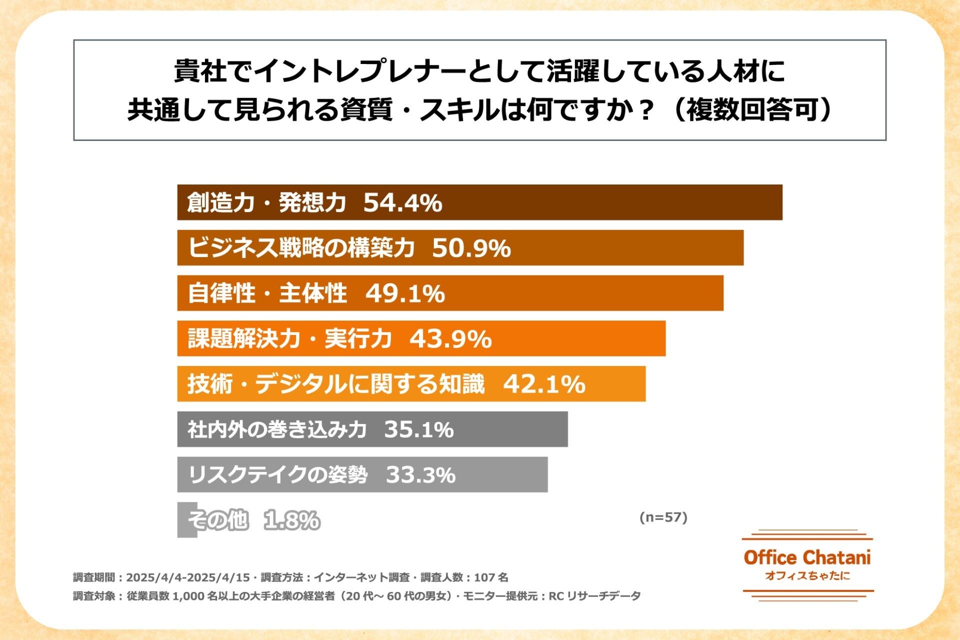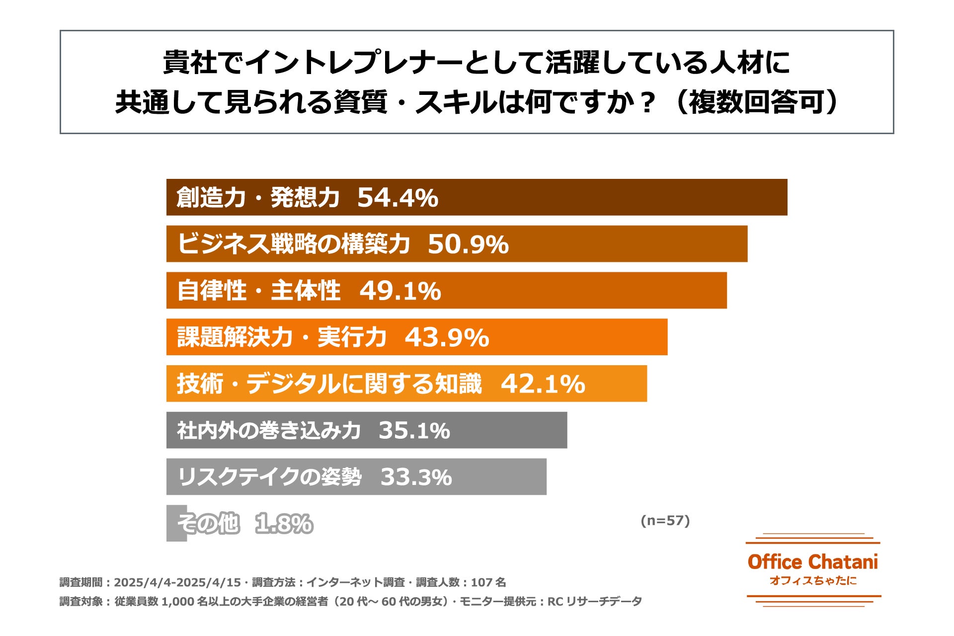イントレプレナーとして活躍する人材に共通して見られる資質・スキルの1位は「創造力・発想力」!―オフィスちゃたに株式会社が明かす、大手企業における事業創造人材「イントレプレナー」の実態