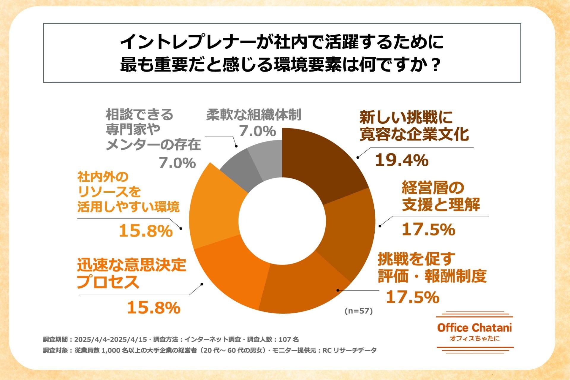 イントレプレナーが社内で活躍するために最も重要だと感じる環境要素は「新しい挑戦に寛容な企業文化」