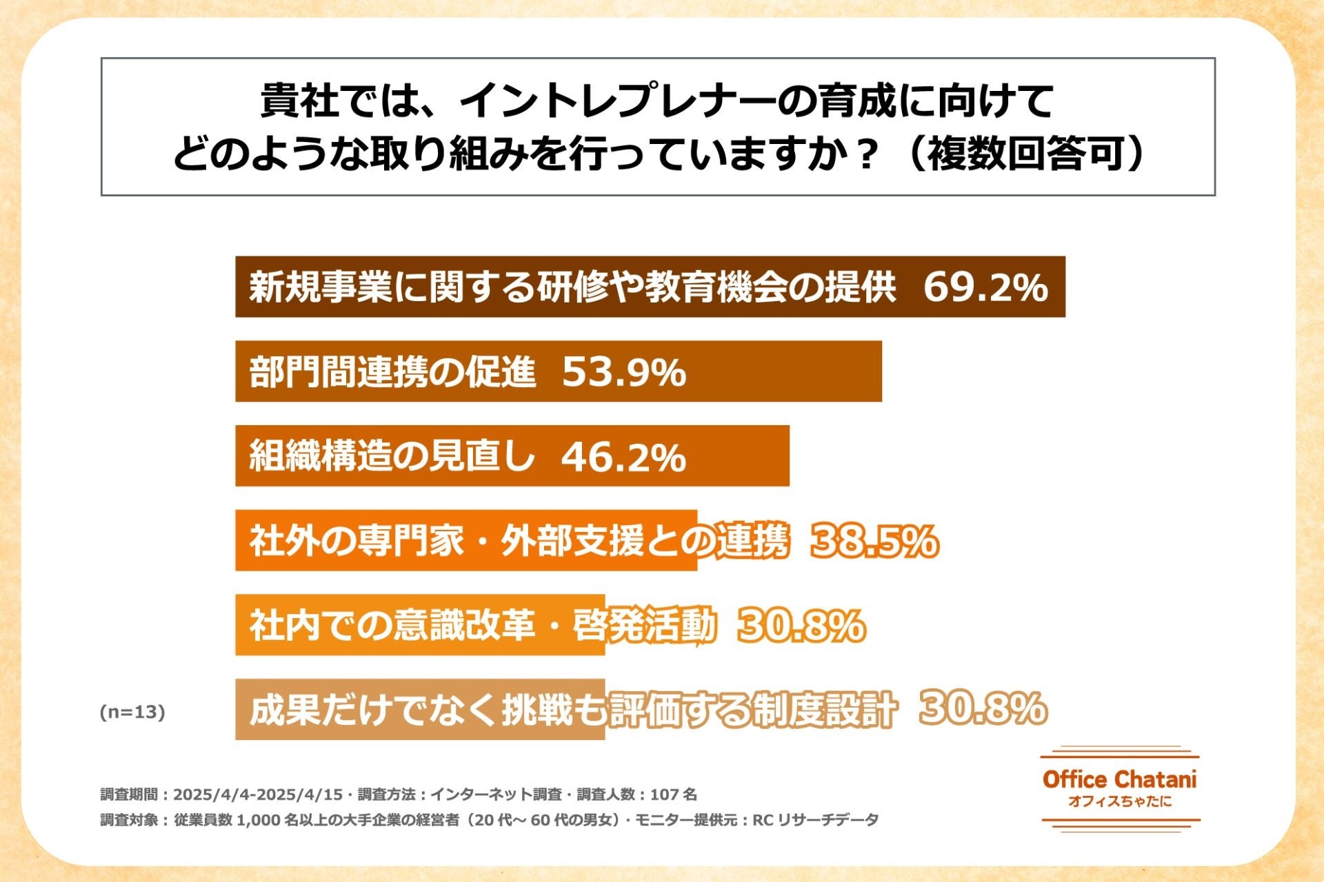続いて、社内に「イントレプレナー」と呼べるような人材が存在しないものの、イントレプレナーの育成に向けた取り組みを行っていると回答された方に「イントレプレナーの育成に向けてどのような取り組みを行っているか」を問う設問の回答では、1位が「新規事業に関する研修や教育機会の提供」で69.2%、2位が「部門間連携の促進」で53.9%、3位が「組織構造の見直し」で46.2%という結果になりました。この結果から、社内に「イントレプレナー」と呼べるような人材が存在しない企業がイントレプレナーの育成に向けて取り組んでいることとしては「新規事業に関する研修や教育機会の提供」が最も多いことが明らかになりました。