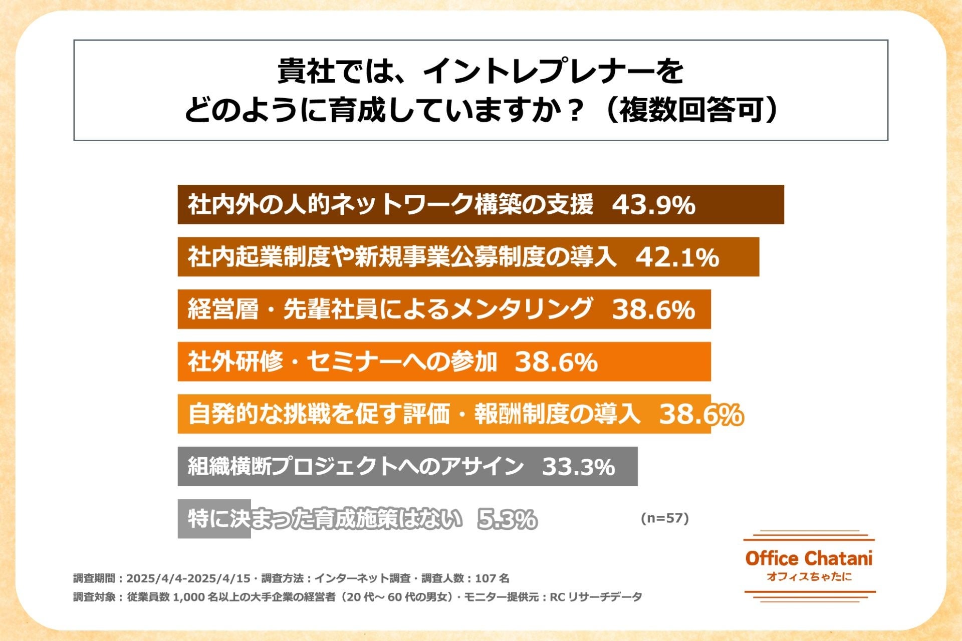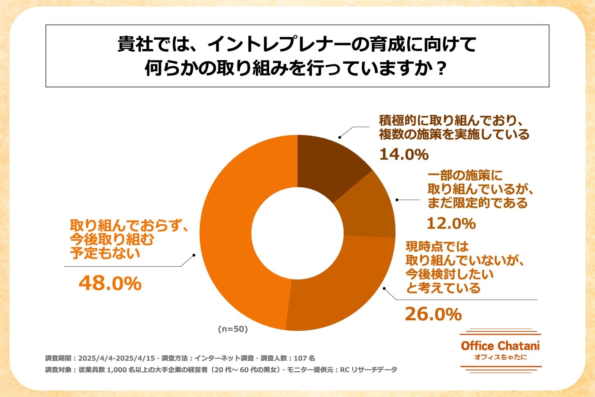 オフィスちゃたに株式会社(代表取締役 茶谷 公之)は、従業員数1,000名以上の大手企業の経営者を対象に、大手企業における事業創造人材「イントレプレナー」に関する実態調査を実施しました。この調査結果から大手企業内の事業創造人材の実態等が明らかになりました。