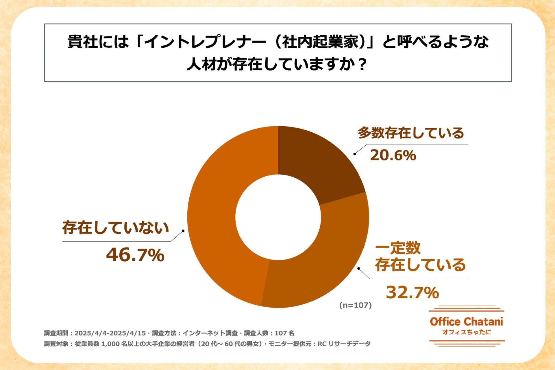 VUCAな時代と言われる現代は、ビジネス環境の変化が激しく、不確実性が高まっています。市場や顧客のニーズが急速に変化する中で、企業には柔軟かつ革新的な対応が求められています。こうした状況下で、事業創造は企業の競争力を維持・強化するために欠かせない取り組みとなっています。一方で、大手企業の経営者はリソースの規模や意思決定プロセスの複雑さゆえに、外部環境への対応だけでなく、内部の組織の硬直化やリスク回避的な文化といった課題も抱えながら、いかにして新しい価値を生み出すかが問われています。中でも注目されているのが、「イントレプレナー(社内起業家)」の存在です。既存の組織構造や文化と時にぶつかりながらも、社内で新たな価値を生み出すことのできる人材が、大手企業において強く求められています。そこで、オフィスちゃたに株式会社は、大手企業の経営者を対象に、大手企業における事業創造人材「イントレプレナー」に関する実態調査を実施しました。