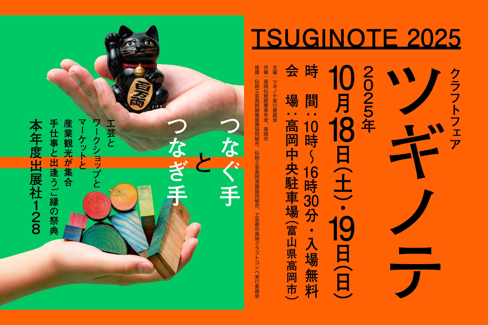 「ものづくりを未来へつなぐ」をテーマに掲げる本イベントは、全国から128社のクラフト作家、クリエイター、製造メーカーが一堂に会する、特化型のクラフトフェアです。伝統産業・工芸のまちとして400年以上の歴史を持つ高岡から、地域や業種の垣根を越え、「つくり手」「つなぎ手」「つかい手」が集い、新たなご縁やアイデアを生み出します。(公式サイト:https://tsuginote.jp/ )