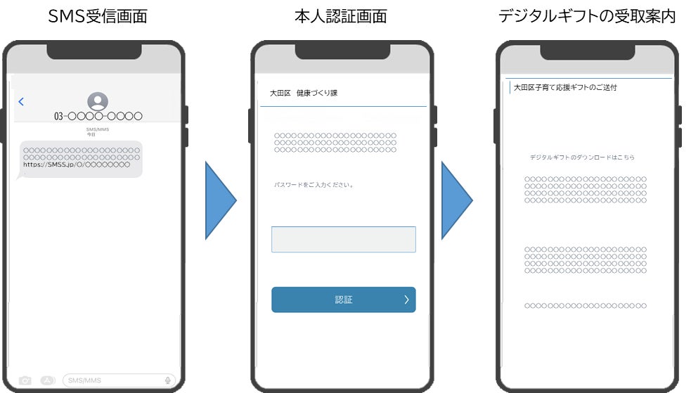 受取対象者本人が申請時に開封パスワード設定を行い、SMS受信時にそのパスワードによる本人認証を行うことで、受取対象者本人へ確実にお届けができるようになりました。