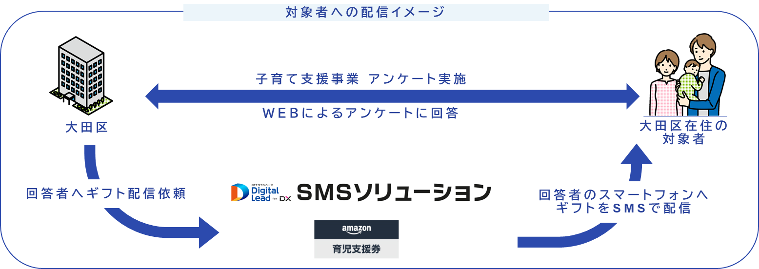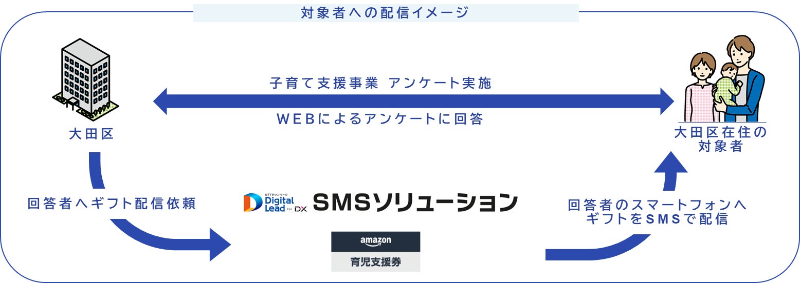 そこで、子育て応援ギフトを従来の紙のギフト券からNTTカードソリューションが調達するデジタルギフト「Amazon育児支援券」に変更するとともに、NTTタウンページが提供するSMS配信サービス「SMSソリューション」を活用してデジタルギフト「Amazon育児支援券」をスマートフォンへ直接送信することで配信のセキュリティを高め、利便性の向上と業務の効率化を図りました。