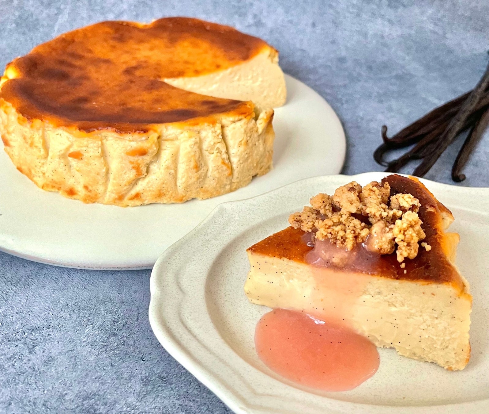 「濃厚バニラのバスクチーズケーキ」は、たっぷりのバニラビーンズを生クリームに一晩漬け込むことで香りを移し、平飼い卵、北海道産クリームチーズと合わせて焼き上げました。トロリととろける食感の中にバニラの芳醇な香りが広がります。添えられた発酵バターの塩サブレにもバニラビーンズが贅沢に使われており、サクサクとした食感がチーズケーキの滑らかな食感に心地良いアクセントをもたらします。バニラビーンズ直輸入会社だからこそできる至極の逸品が完成しました。