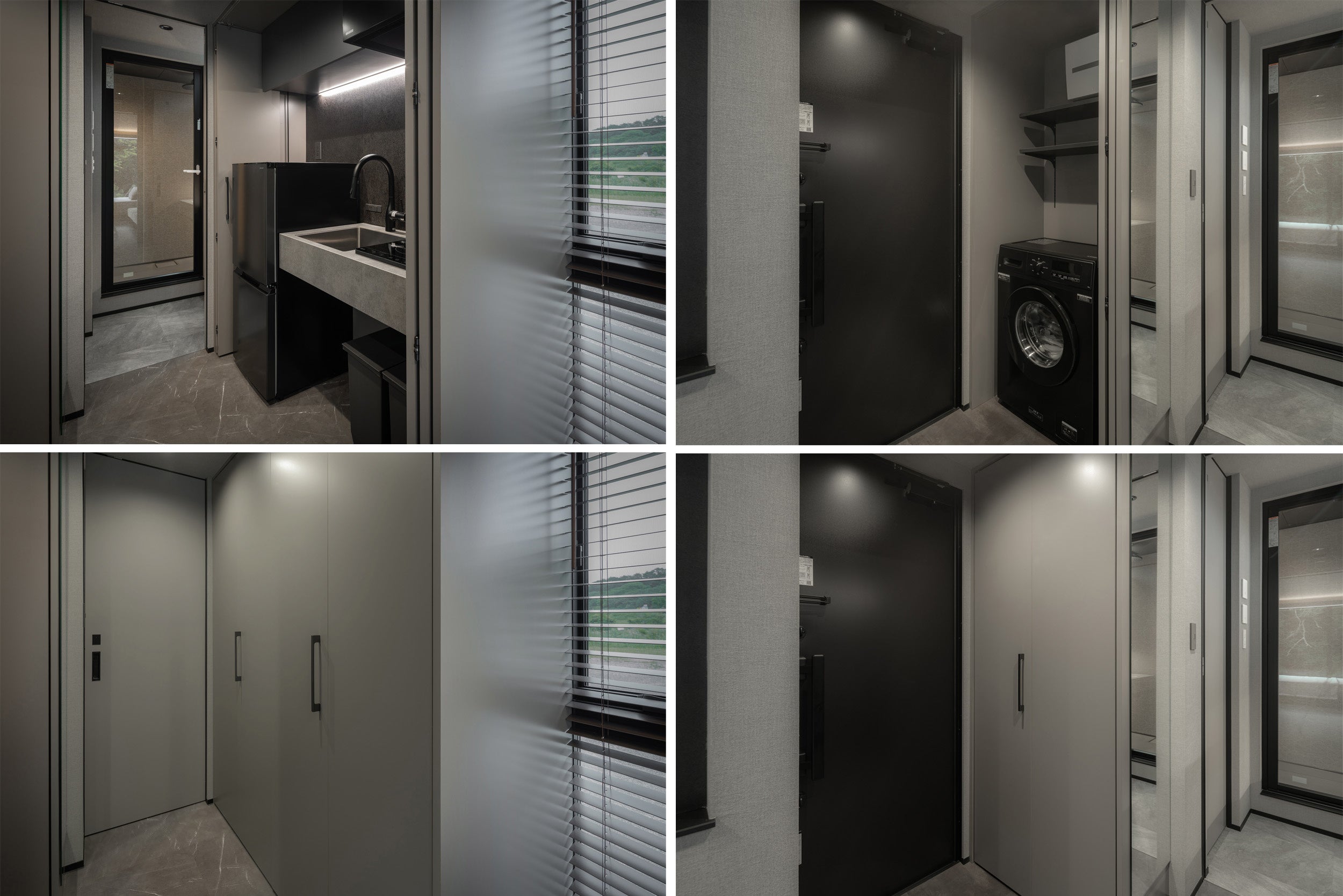 生活感を隠すための優雅な収納設計を採用し、限られた空間を最大限に活用するために、キッチンや家電類を折り畳み式キャビネットに収納可能としました。