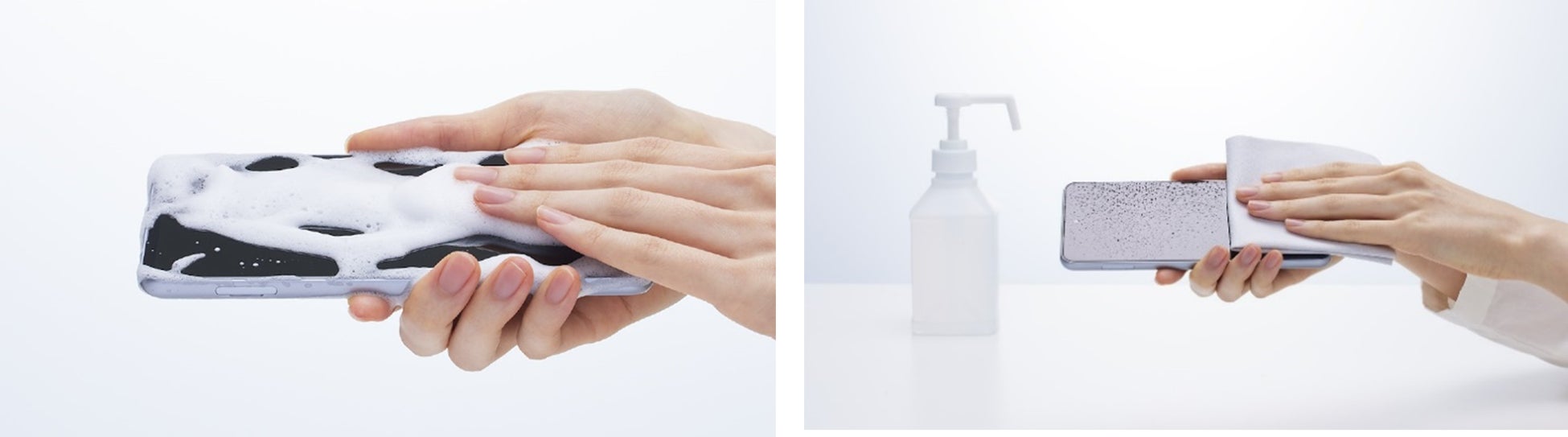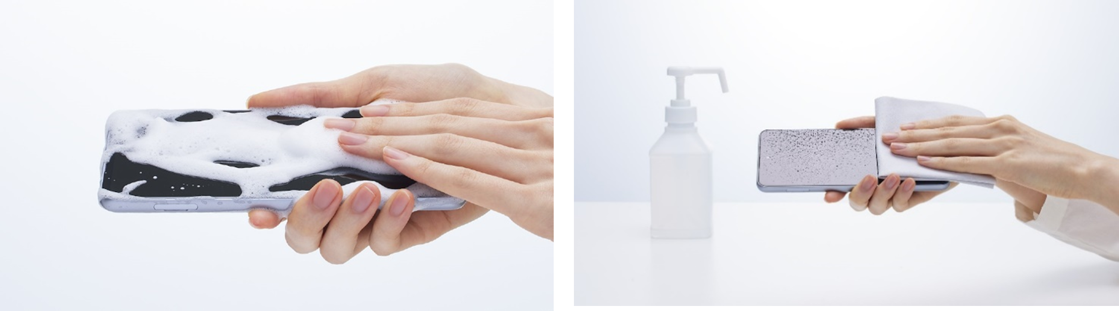 拭き取りによる場合、アルコール除菌シートまたはキッチンペーパーに液剤を浸み込ませたもので製品を拭き取ってください。