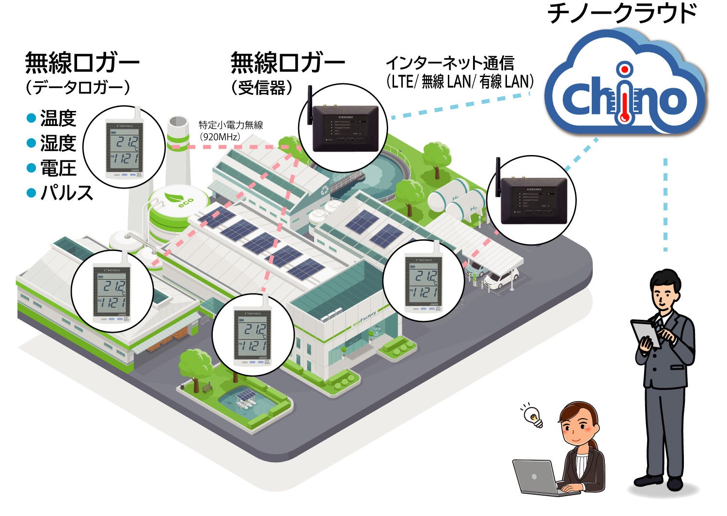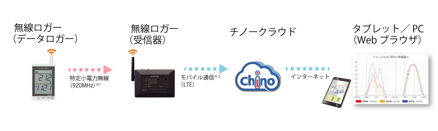 無線ロガーで測ったデータが自動的に「チノークラウド」に収録され、ユーザーはスマートフォンやタブレット、パソコンなどから、いつでも、どこでも、確認できるようになりました。