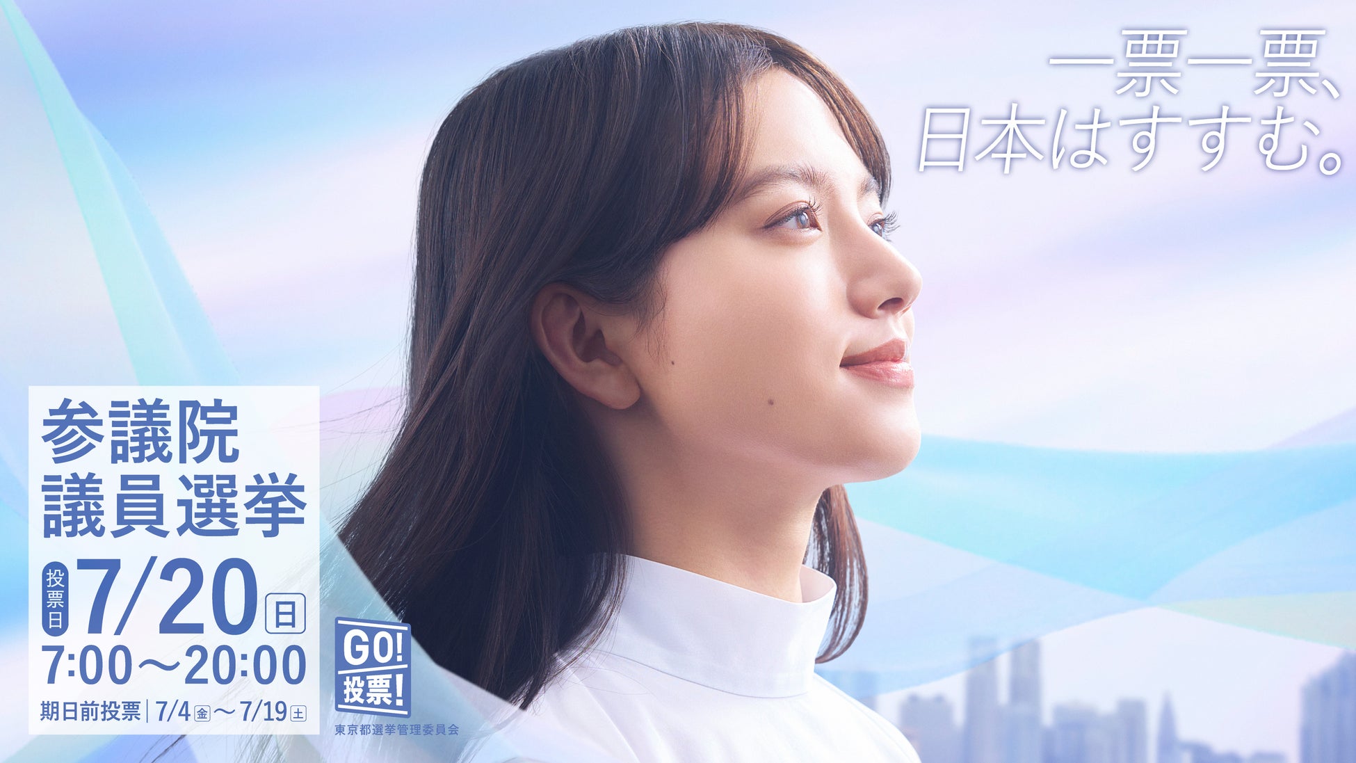 東京のみなさん、こんにちは。清原果耶です。はじまります、参議院議員選挙。みなさんは一票にどんな想いを込めたいですか。自分はもちろん、家族や友人、大切な誰かのために投票に行く。そんな想いが積み重なって日本は一歩一歩すすんでいく。選挙って一人ひとりがキーパーソンなんです。一票一票 日本はすすむ。参議院議員選挙、都合がつかない方はぜひ期日前投票をお願いいたします。詳しくはサイトなどをチェックしてください。