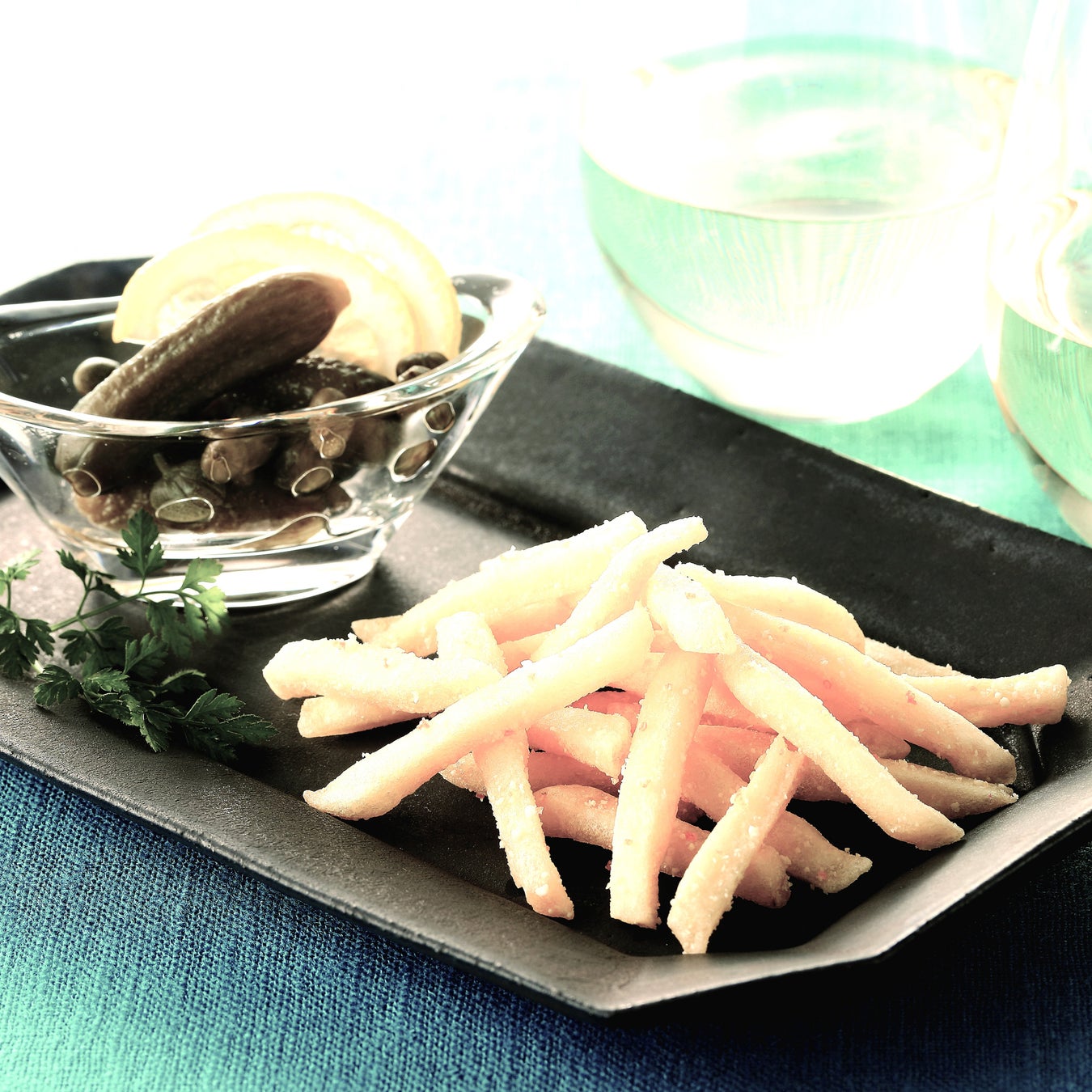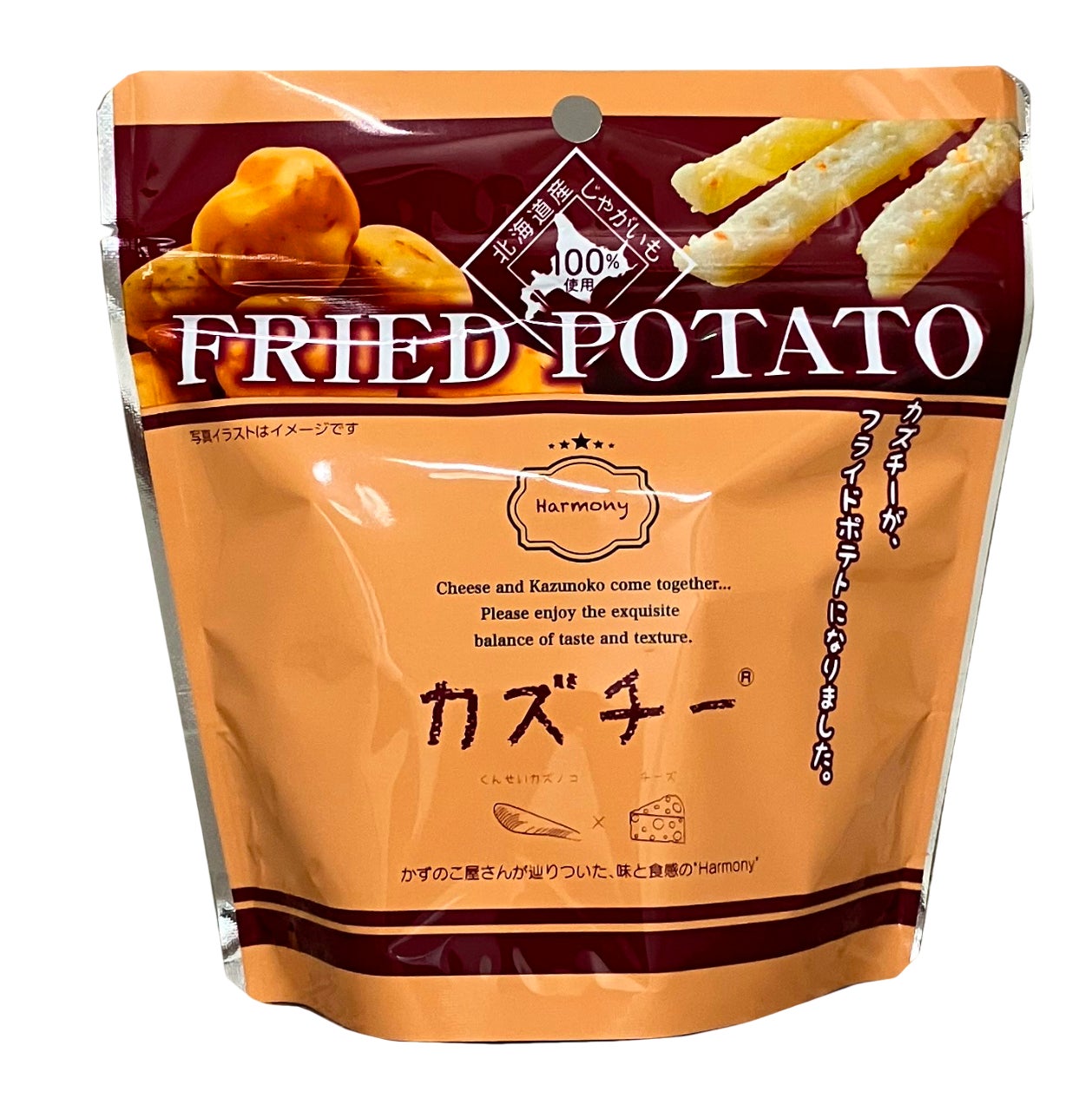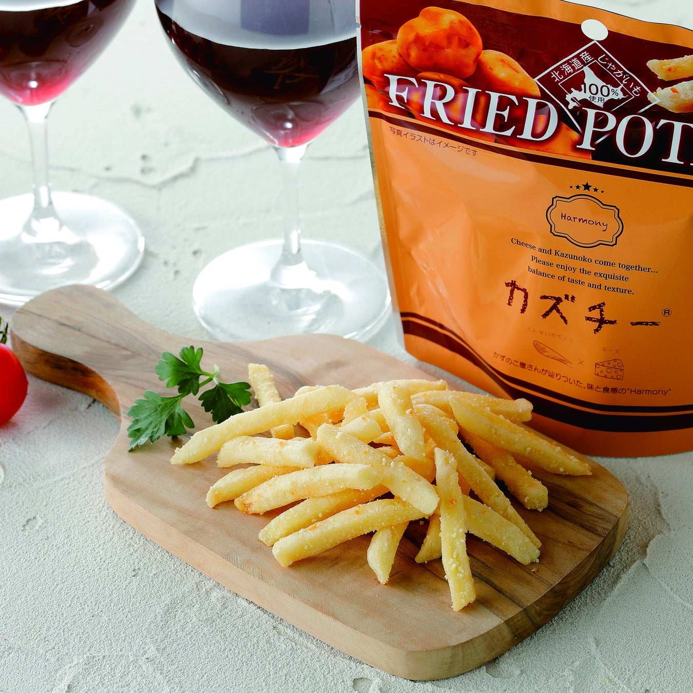 かずのことチーズの絶妙なハーモニーで人気を誇る、北海道を代表するおつまみ「カズチー」。そのカズチーの美味しさをそのままスナック菓子にした『カズチーフライドポテト』。フライドポテトのサクサク食感に、カズチーをフリーズドライしパウダー状にした特製シーズニングをまぶし、燻製の香ばしさとチーズのコクをしっかりと感じられる味わい。おやつにも、おつまみにも最適!ワインやビールとの相性抜群!じゃがいもは北海道産を使用。