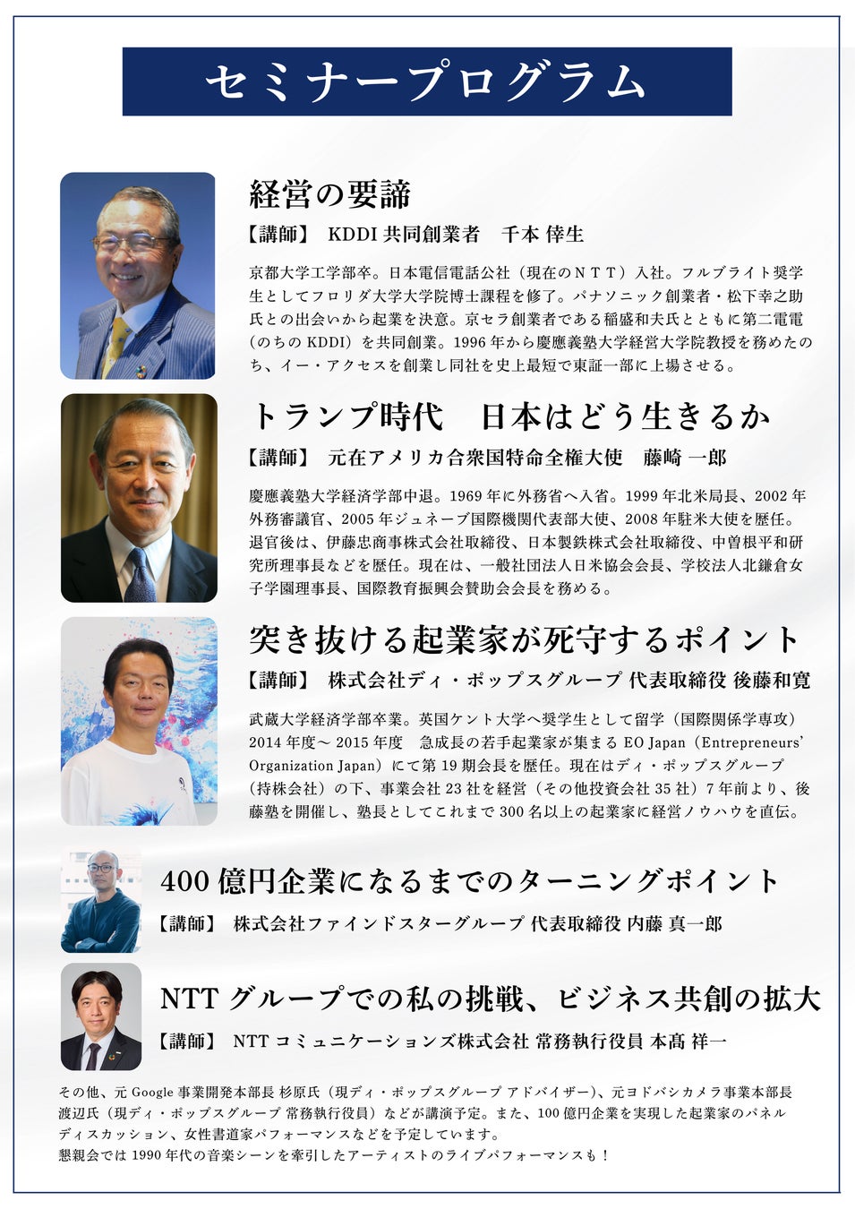 また、ファインドスターグループの代表取締役である内藤真一郎氏や、NTTコミュニケーションズの常務取締役である本髙祥一氏、そしてグループ会社経営だけでなく後藤塾塾長として350名の経営者の支援を行ってきたディ・ポップスグループ代表取締役の後藤も登壇いたします。