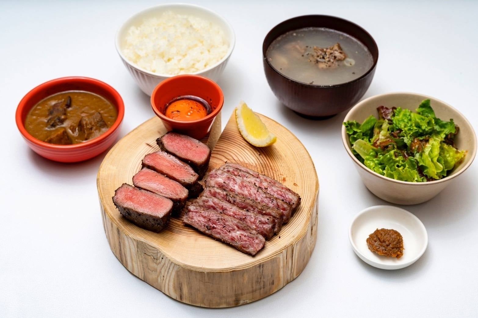たん元を超厚切りにカットし焼き上げた「極み」ステーキと、A5黒毛和牛のザブトンの盛り合わせ。ザブトンは表面をさっと炙って薄くスライスし、特濃卵黄と絡めながらスキヤキ風にお召し上がりいただくことで、一層まろやかで深い味わいをお楽しみいただけます。