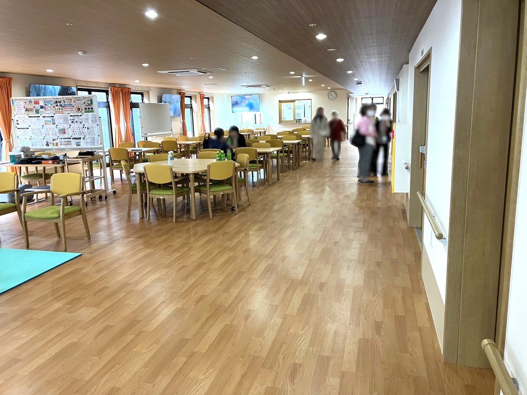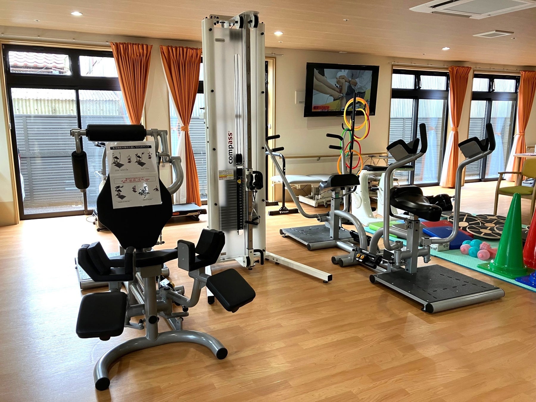 明るく広い食堂兼リハビリスペースは205㎡で、同時に20名までのリハビリに対応。ドイツの認証(TUV/ZAT)を取得した信頼性の高い機器を5台設置しています。