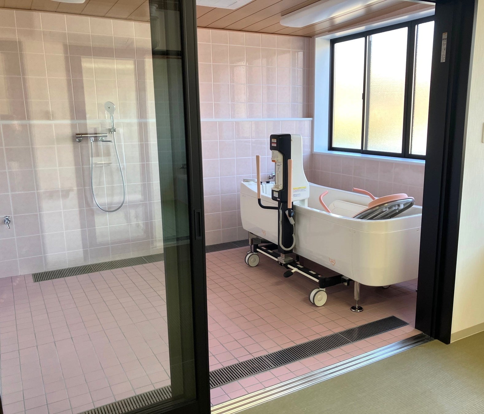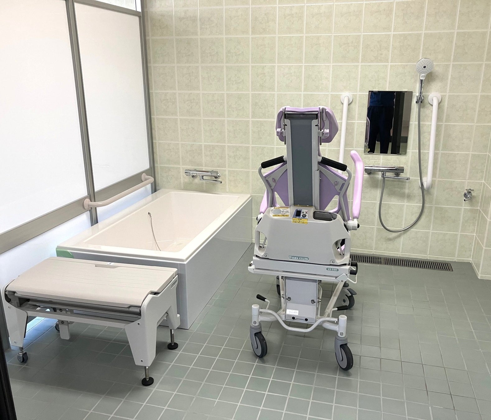 「天然温泉=ナトリウム‐炭酸水素塩温泉」の浴室で、ゆったりと入浴いただけます。リハビリプログラムに温泉療法を取り入れることで、生活の中で楽しみながらリハビリに取り組んでいただけます。機械浴、個浴の設備も備え、利用者様のご希望に沿った対応が可能です。