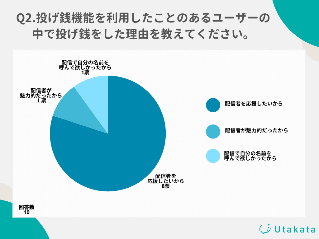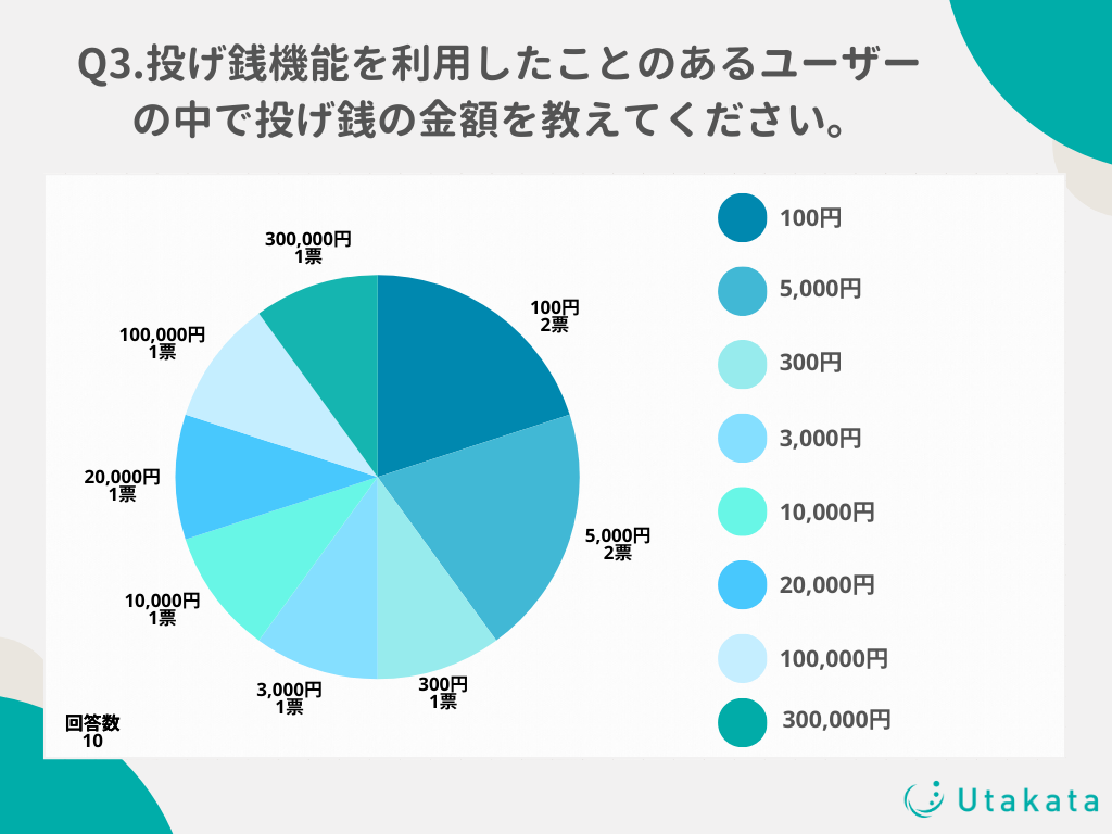 「『投げ銭をしたことがある』と回答いただいた方は投げ銭をした理由を教えてください。」と質問したところ、「配信者を応援したいから」が8票、「配信者が魅力的だったから」が1票、「配信で自分の名前を呼んで欲しかったから」が1票という回答となりました。また、投げ銭金額では「100円」が2票、「300円」が1票、「3,000円」が1票、「5,000円」が2票、「10,000円」が1票、「20,000」が1票、「100,000円」が1票、「300,000円」が1票という回答となりました。