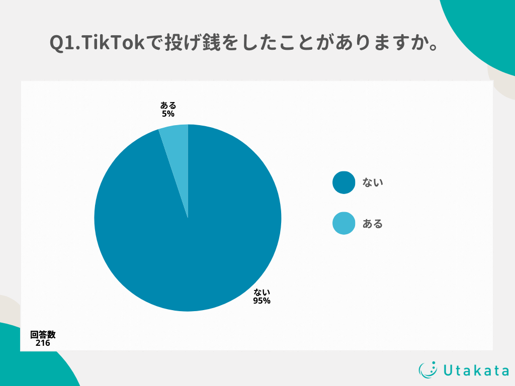 ショート動画SNSの運用やインフルエンサーキャスティングを行う株式会社Utakata(https://utakata.co.jp/)は、TikTokアプリをインストールした10代〜50代の男女216名を対象に、「TikTokで投げ銭をしたことがあるか」に関する調査を実施いたしましたのでお知らせいたします。TikTok LIVEは巷で人気のライブ配信プラットフォームですが、投げ銭機能の利用率内訳はどうなのでしょうか。