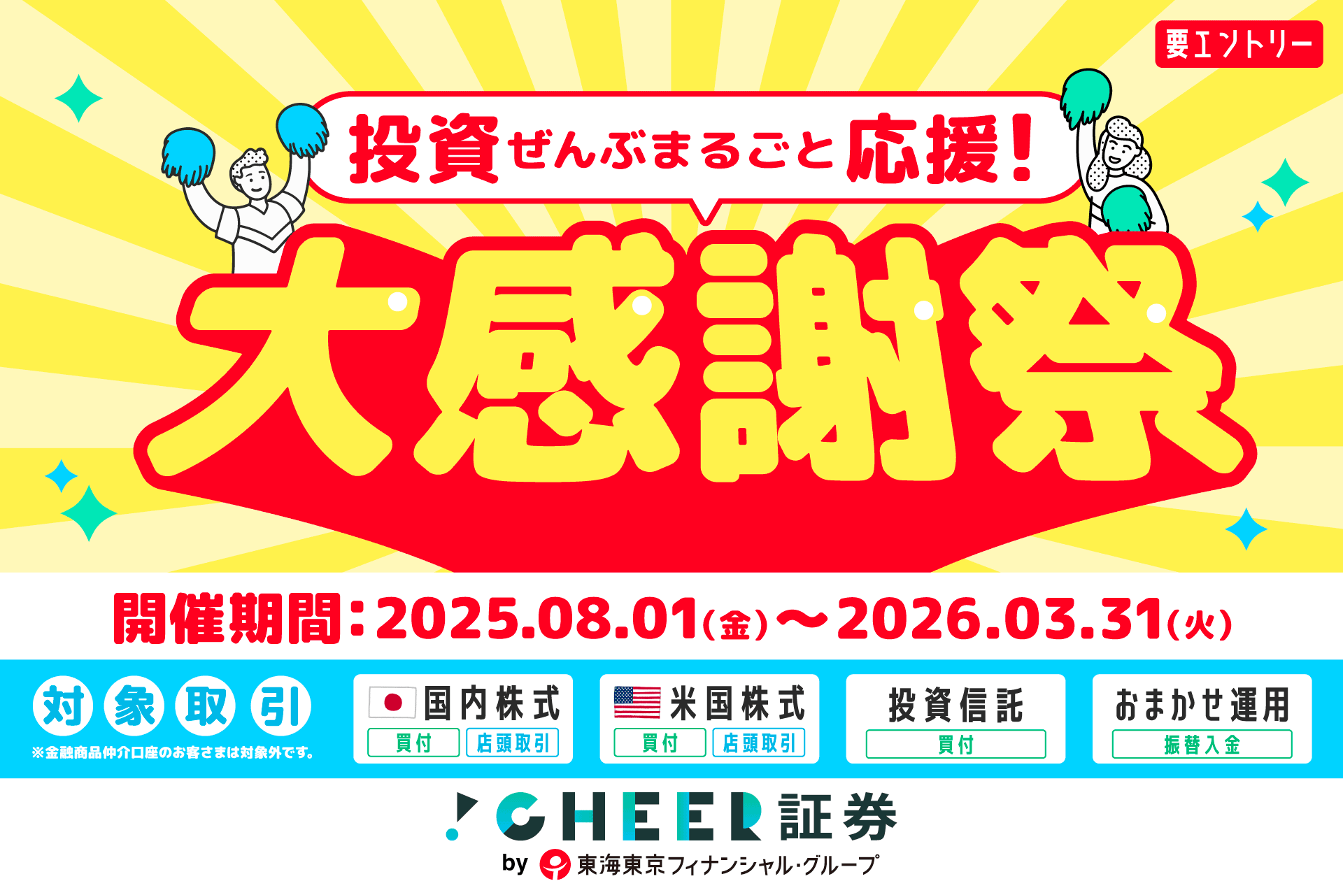 CHEER証券株式会社(以下「CHEER証券」)は、日頃ご利用いただいているお客さまへ感謝を込めて、2025年8月1日(金)より「投資ぜんぶまるごと応援!大感謝祭」を実施いたします。