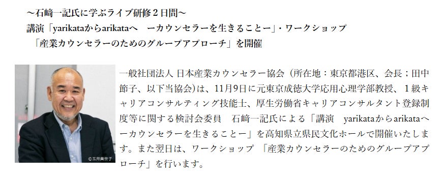 一般社団法人 日本産業カウンセラー協会(所在地:東京都港区、会長;田中節子、以下当協会)は、11月9日に元東京成徳大学応用心理学部教授、1級キャリアコンサルティング技能士、厚生労働省キャリアコンサルタント登録制度等に関する検討会委員 石﨑一記氏による「講演 yarikataからarikataへ ーカウンセラーを生きることー」を高知県立県民文化ホールで開催いたします。また翌日は、ワークショップ 「産業カウンセラーのためのグループアプローチ」を行います。