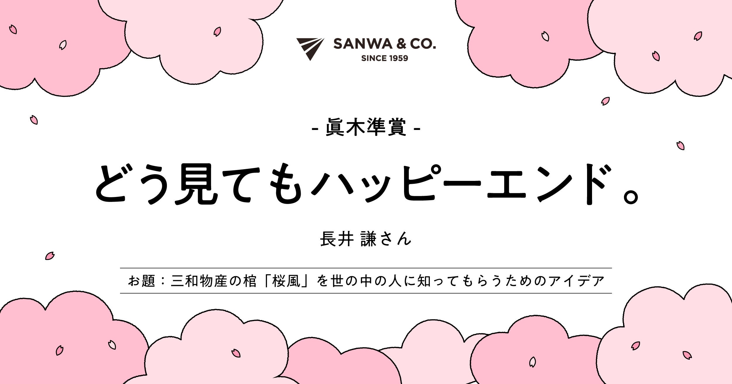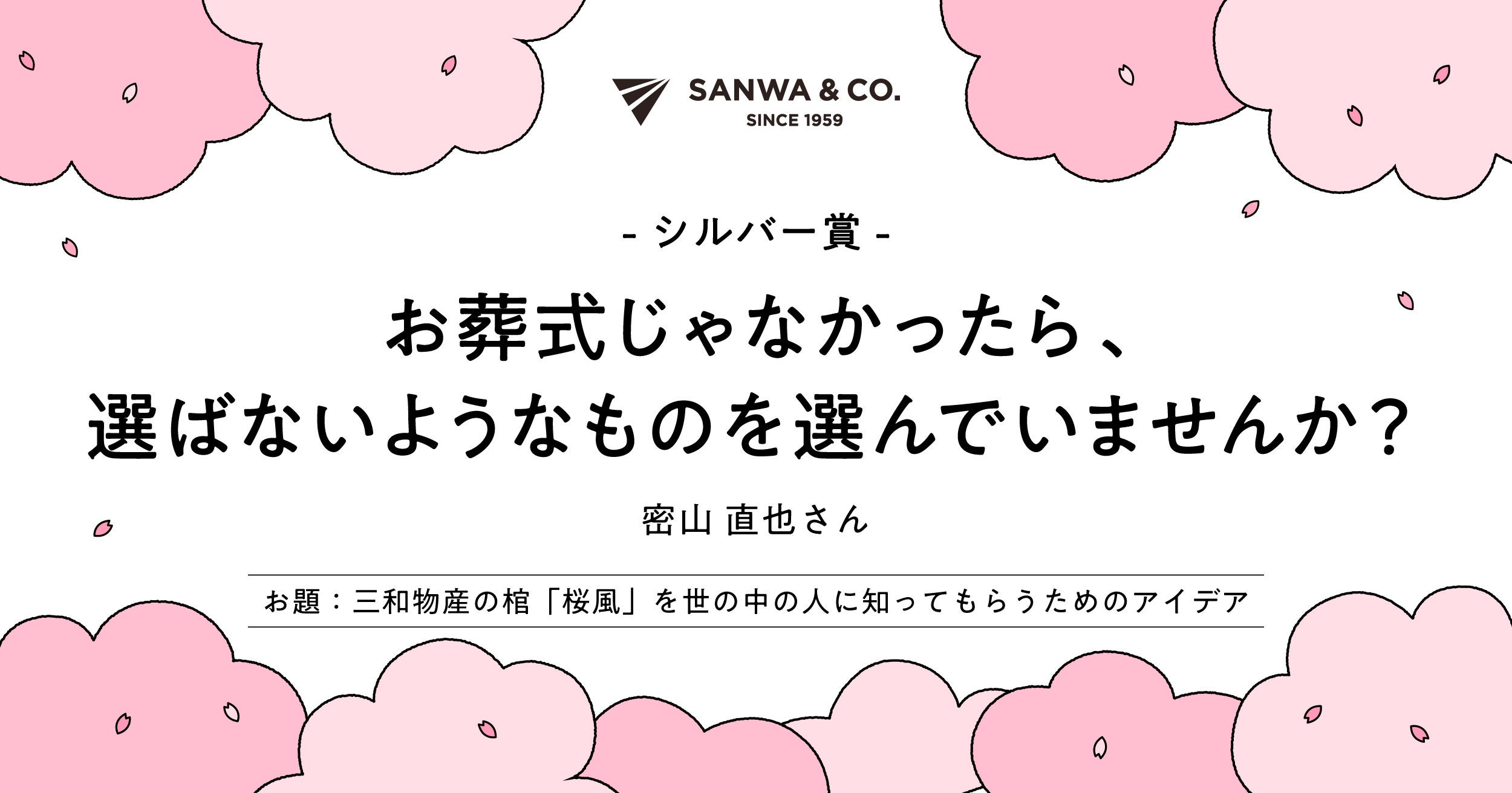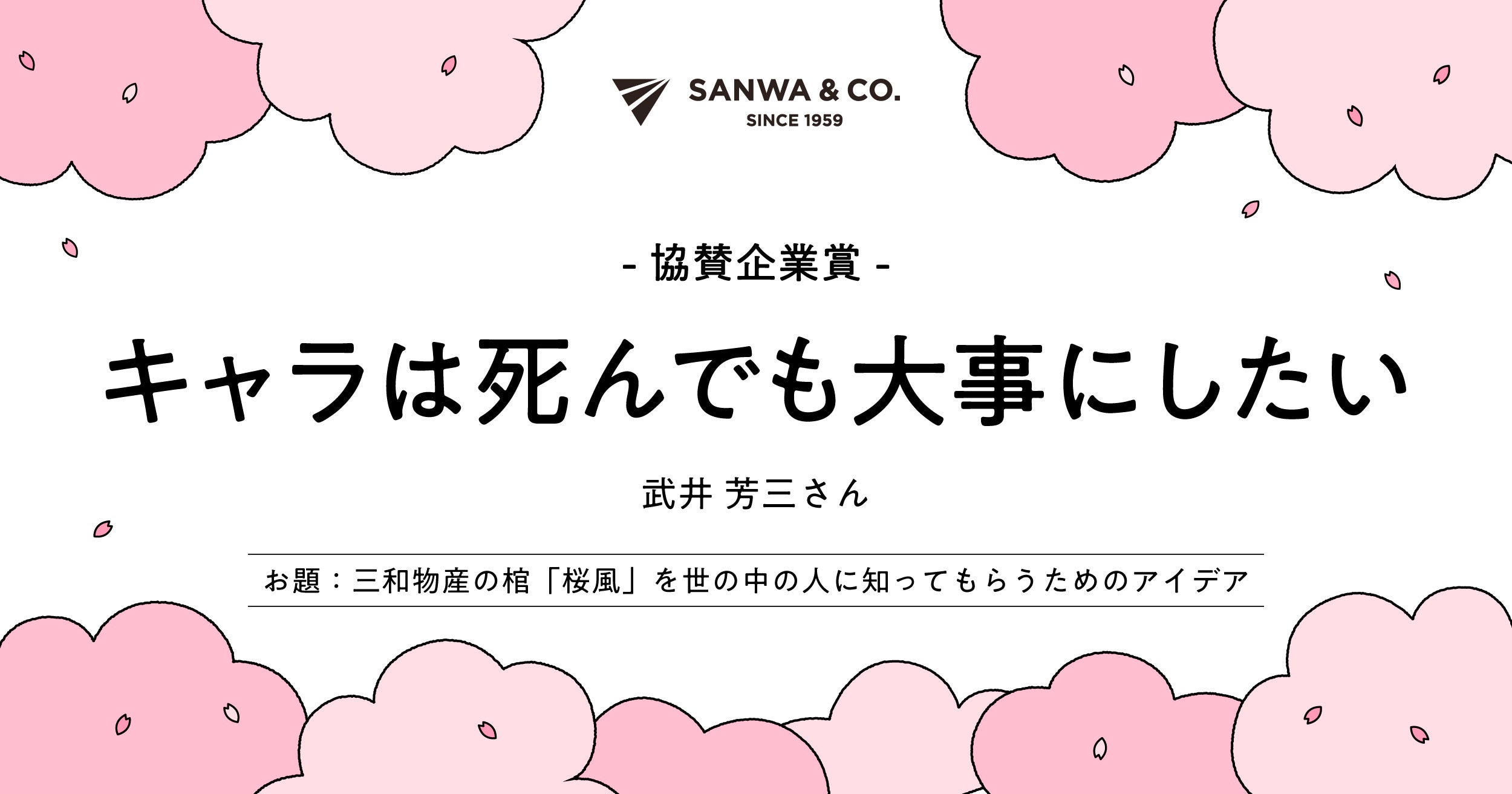 葬祭商品の企画・課題解決・提供をトータルでサポートする三和物産(本社:石川県金沢市 代表取締役:⻄河誠人)は、日本最大級の公募広告賞である第62回「宣伝会議賞」(主催:株式会社宣伝会議)において、三和物産のオリジナル棺「桜風(さくらかぜ)」を世の中に知ってもらうためのキャッチコピーを、8月30日(金)から11月5日(火)の期間で募集しました。