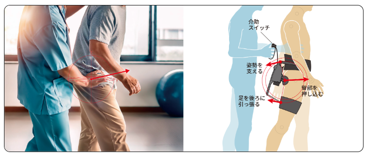 inoGear HE-1は、理学療法士の感覚に頼ってきた属人的な歩行介助を、設定と操作で再現できる仕組みへと変える、歩行リハビリテーション用ロボティック装具です。歩行リハビリテーションの現場では、理学療法士が患者の股関節や骨盤を徒手で操作する「ハンドリング」が歩行支援に不可欠です。しかし、この技術は経験や感覚に依存するため、再現性や継承が難しいという課題がありました。inoGear HE-1は、従来アプローチが難しいとされてきた「股関節の伸展」に焦点を当てた新発想のリハビリ用ウェアラブルロボットです。モーターとワイヤーにより、熟練した理学療法士の徒手技術を再現。従来のアシストスーツが提供する「力のアシスト」だけでなく、正しい歩行姿勢に導く「技のアシスト」を実現します。