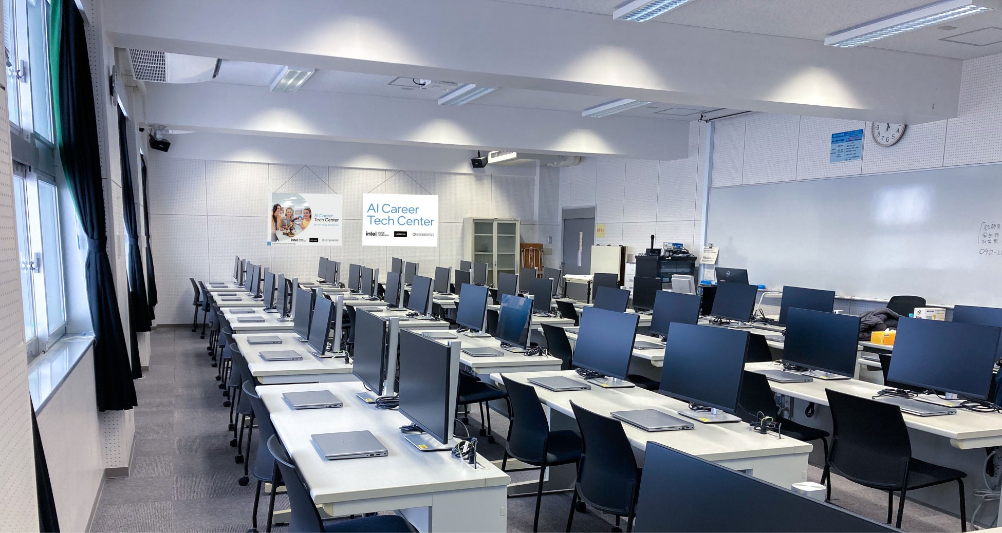 内田洋行は、「AI Career Tech Center」において、高性能PCの選定・導入からネットワーク・教室環境の整備までを総合的にサポートし、既存教室を最大限に活用した新たな学びの空間を創り上げました。また、インテルは本センターに対してAIの仕組みや活用方法を体系的に学び、将来の産業界で即戦力となる人材を育成するための実践的なカリキュラム「AI for Future Workforceプログラム」やAI教育に適した機材やツールの提案を通じて、理論と実践を融合させた学びを支援しています。
