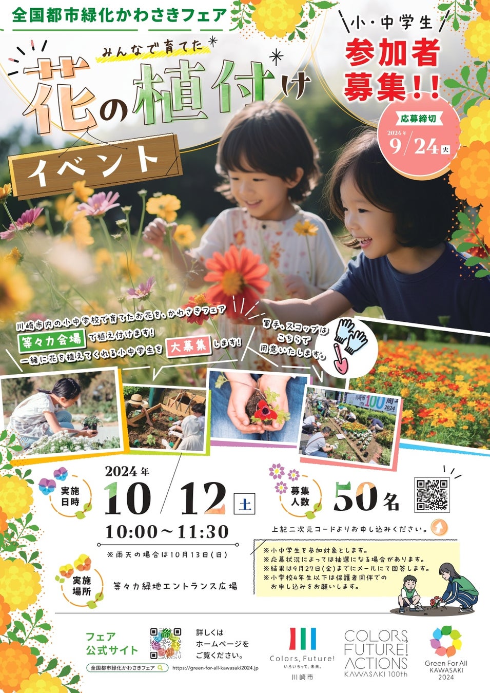 令和6(2024)年、川崎市は全国都市緑化かわさきフェアの一環として、川崎市内の小中学校で育てた花を、等々力緑地会場の花壇へ植え付けする小中学生参加型イベントを10月12日(土)に開催します。本イベント開催に伴い、一緒に花を植え付けてくれる50名の小中学生を9月2日(月)~9月24日(火)の期間で募集いたします。