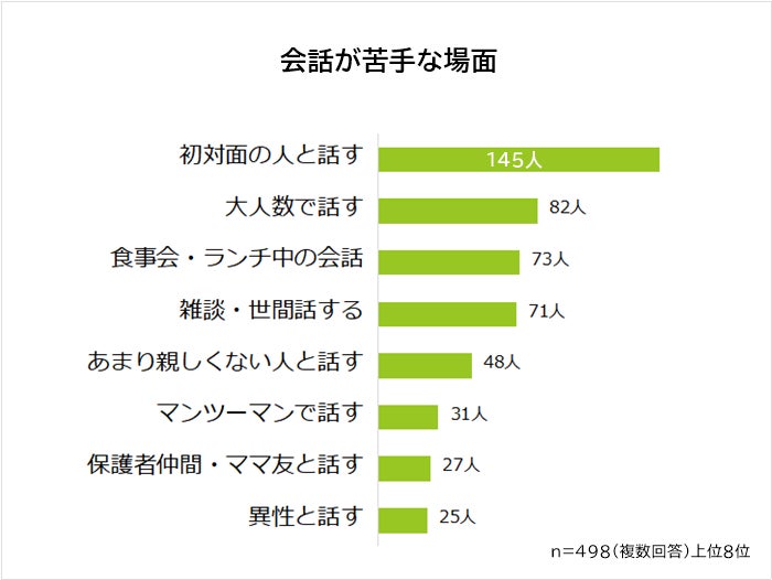 会話が苦手だと感じる場面の1位は「初対面の人と話す(145人)」でした。2位「大人数で話す(82人)」、3位「食事会・ランチ中の会話(73人)」、4位「雑談・世間話する(71人)」が続きます。
