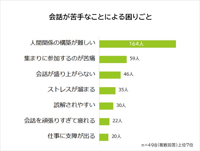 会話が苦手ことによる困りごとで最も多かった回答は「人間関係の構築が難しい(164人)」でした。2位「集まりに参加するのが苦痛(59人)」、3位「会話が盛り上がらない(46人)」が続きます。