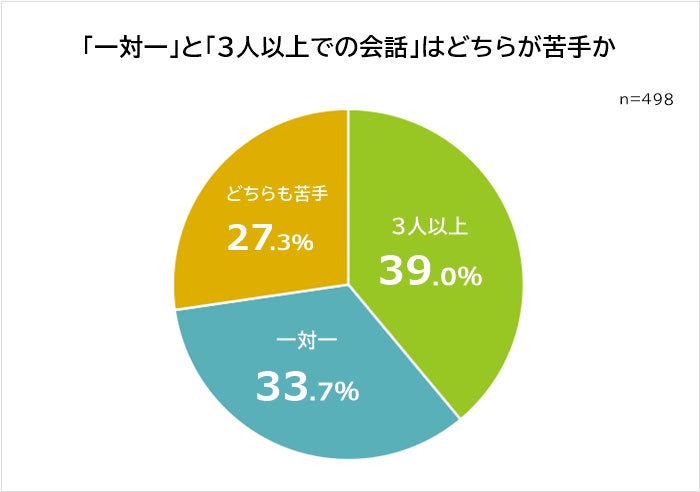 「一対一」と「3人以上」の会話では、「3人以上での会話が苦手」という人が39.0%で、一対一が苦手な人よりやや多い結果になっています。