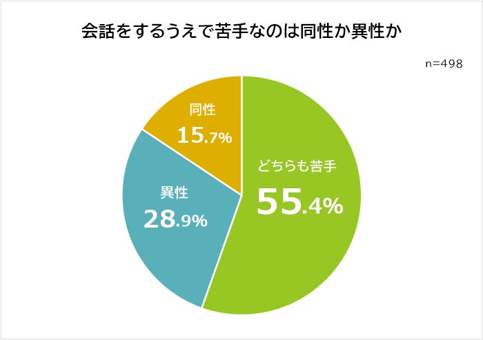 会話が苦手な498人に「異性と同性、どちらと話すのが苦手か」を聞いたところ、半数以上が「どちらも苦手」と回答。「うまい返しがすぐに出てこない」「一方的にしゃべりすぎてしまう」といった場合、相手の性別に関わらず、うまく会話できないことが多いのではないでしょうか。