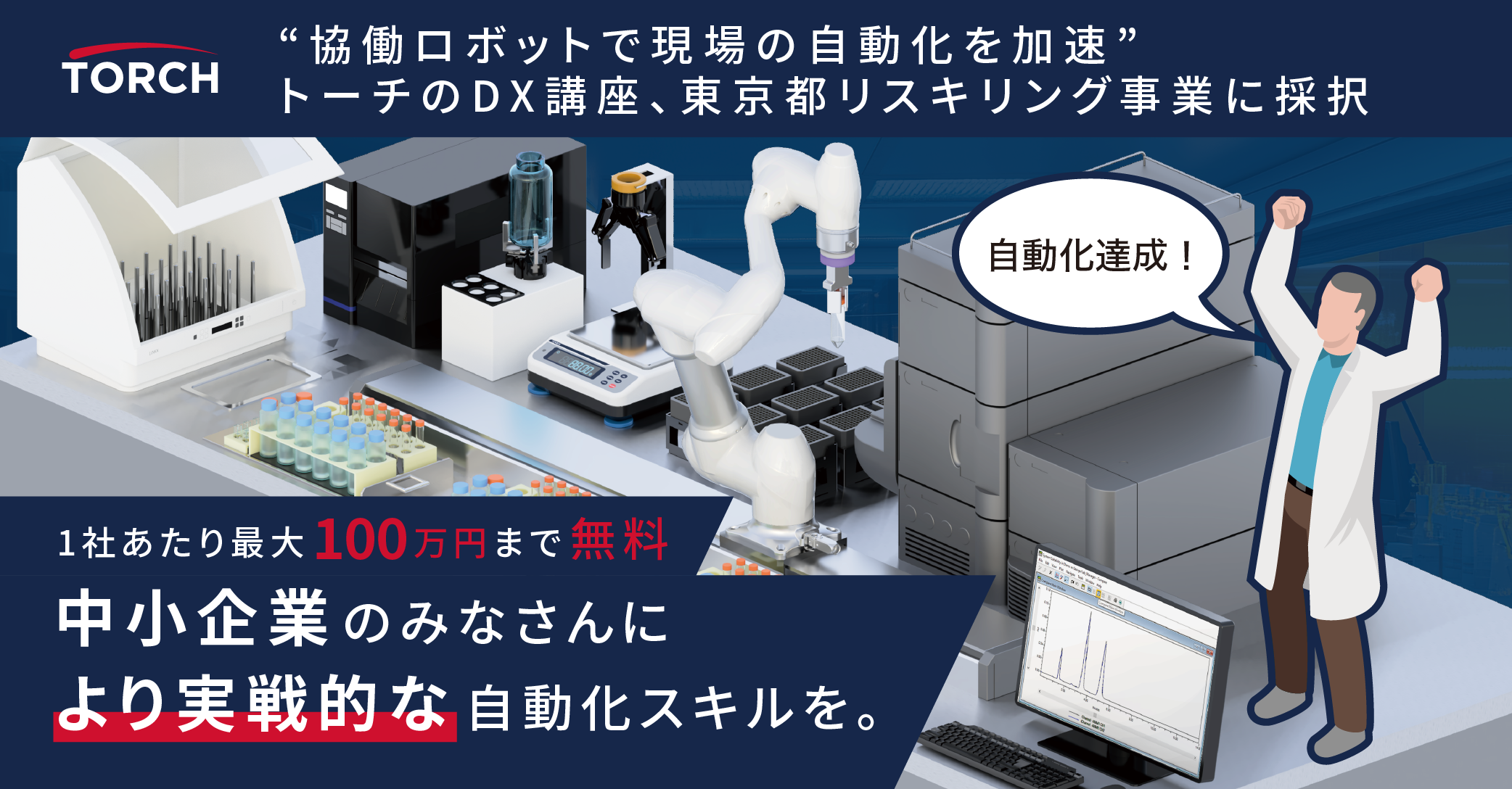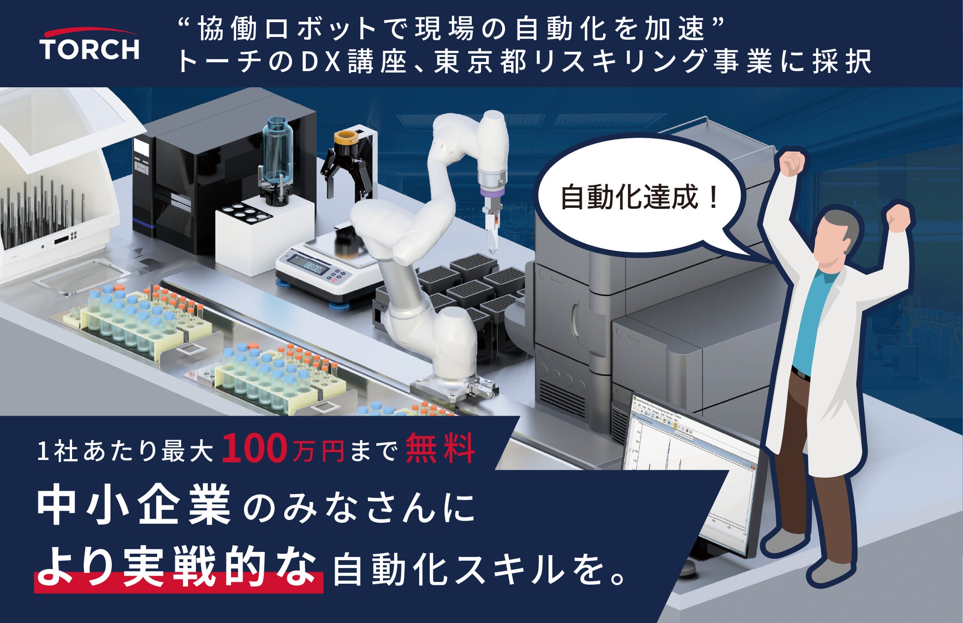 ラボオートメーションをリードするトーチ株式会社(本社:東京都港区、代表取締役社長:石澤 祐介)は、公益財団法人東京都中小企業振興公社が提供し、トランスコスモス株式会社が運営を担う「令和7年度 スタートアップを活用したリスキリングによる中小企業デジタル化支援」事業において、講座提供企業として採択されましたのでお知らせいたします。