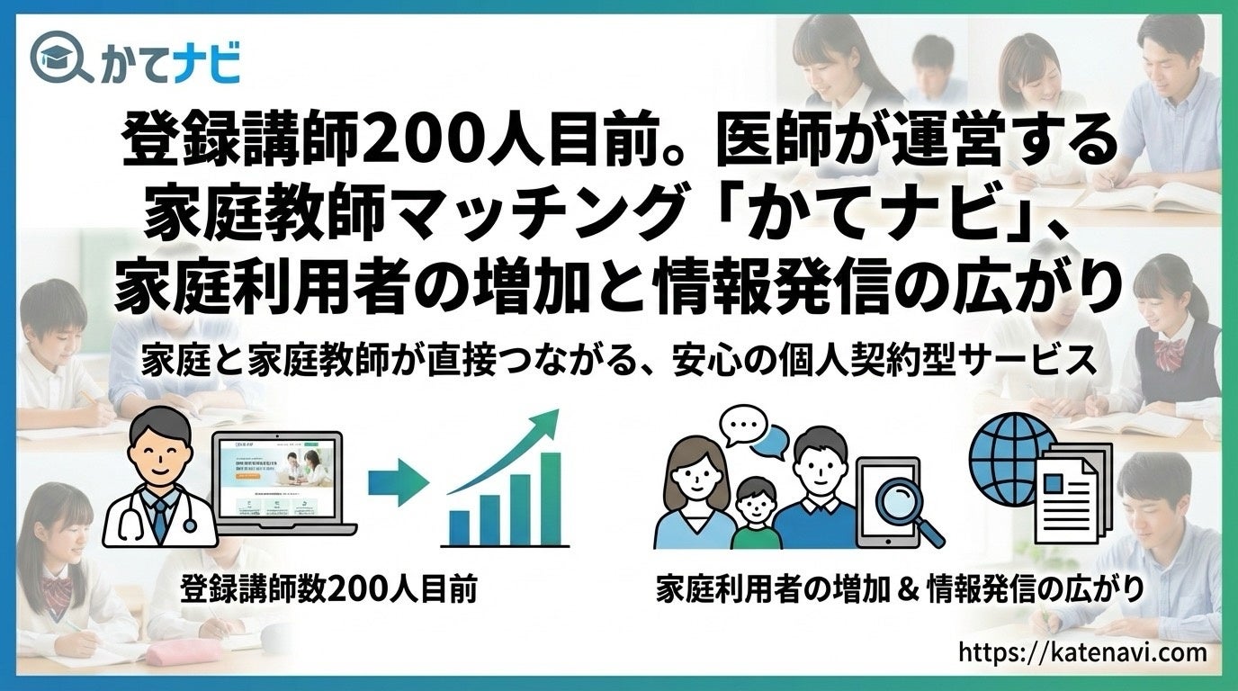 登録講師200人目前。医師が運営する家庭教師個人契約マッチング「かてナビ」、家庭利用者の増加と情報発信の広がり
