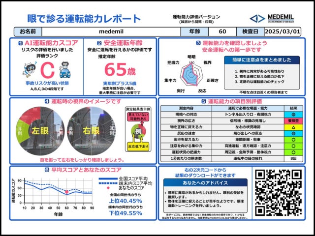 MEDEMIL Drive®をインターネットに接続すると、運転能力スコアの「世代別の全国平均」と「同世代内でのランキング」がレポートに記載されるよう改良しました。ご自身の運転能力スコアの参考にお使いいただけます。