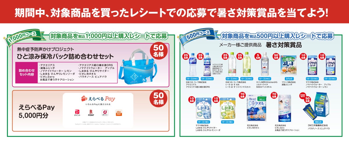 キャンペーンの内容は、本キャンペーン応援企業の対象商品を500円か1,000円ご購入したレシートをキャンペーンサイトから応募頂くと、抽選で応援企業から提供して頂きました「暑さ対策商品」や「ひと涼み保冷バッグ詰め合わせセット」「えらべるPay5,000円分」などが当たるキャンペーン内容になっております。