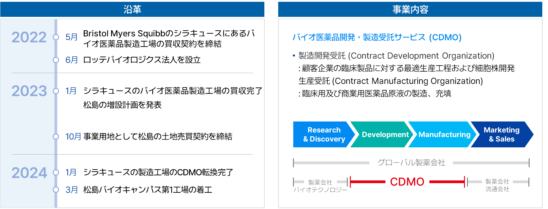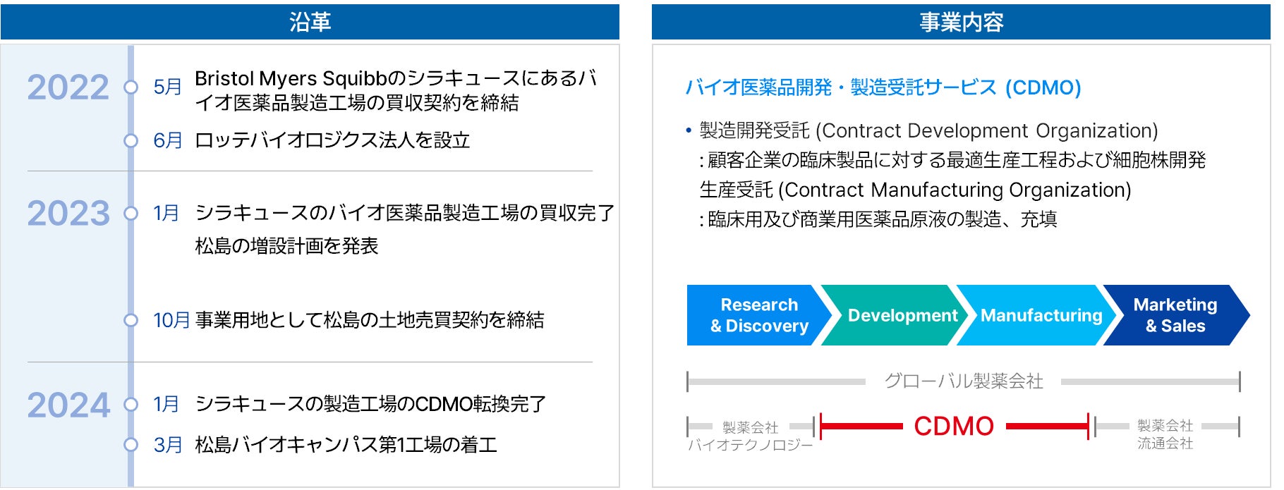 ロッテバイオロジクスは、より健康的な世界を可能にする良質なバイオ医薬品を提供するため、2022年に韓国と日本のロッテグループ共同出資で韓国のソウルに設立されたグローバルCDMO(医薬品開発製造受託)企業です。翌2023年にブリストル・マイヤーズ・スクイブ社の米国シラキュースにあるバイオ医薬品製造拠点を買収し、バイオ医薬品CDMO事業に参入しました。また、現在仁川市に3つの最新の生産プラントと補助施設を収容する「松島バイオキャンパス」を建設中です。