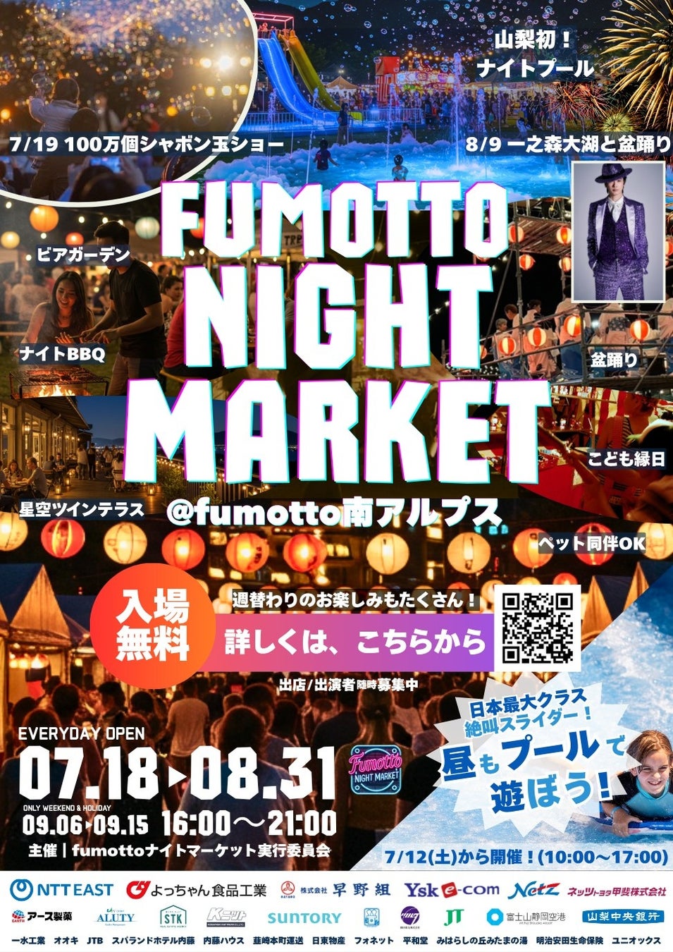また、夏休み期間中は連日16時から「fumottoナイトマーケット」も同時開催いたします。子どもたちはプールで思い切り遊び、大人たちはビアガーデンや地元グルメを堪能しながら、採れたての農産物やクラフトショップでの買い物も楽しめます。さらに、日替わりスペシャルプログラムとして、盆踊り、シャボン玉ショー、カラオケ大会、大道芸、ダンス大会など、バラエティ豊かなイベントも多数予定しています。