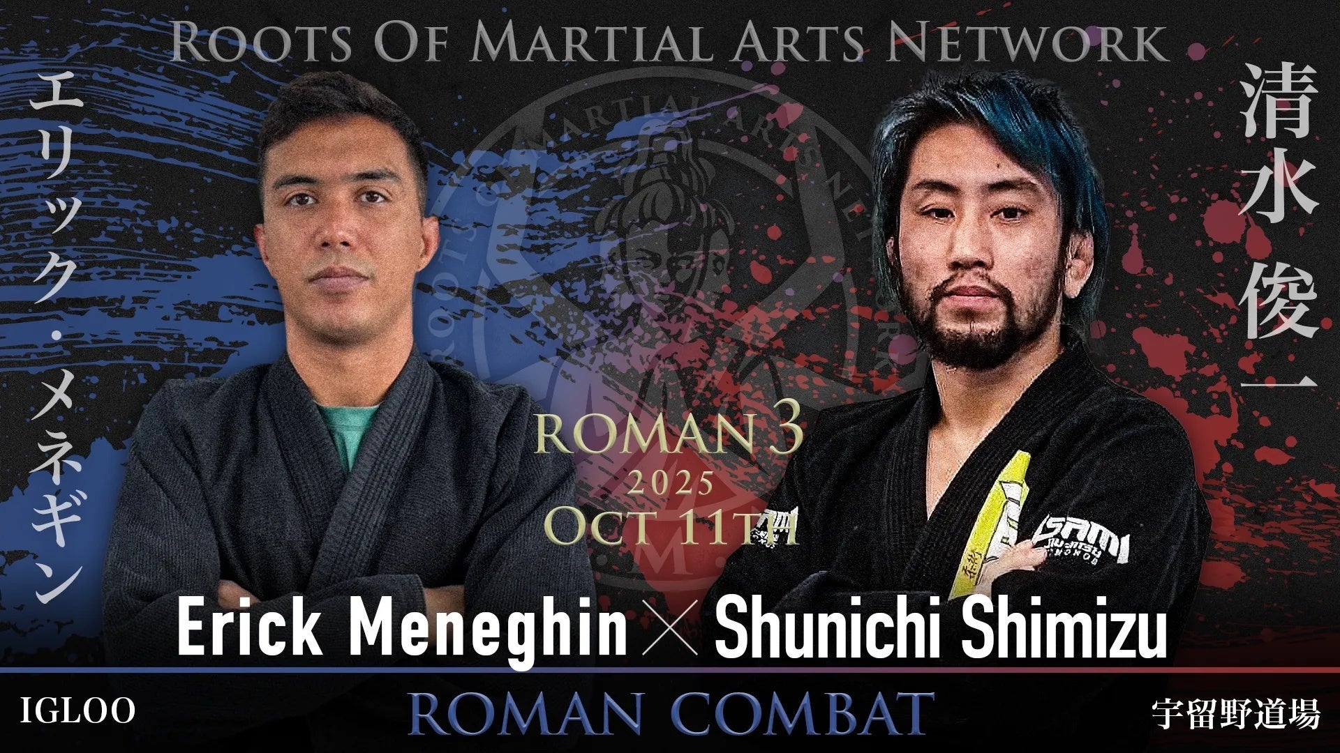 初参戦する新進気鋭のトップ柔術家メネギンがROMAN連続参戦の清水と激突。MMA大ベテランの清水の総合力と柔術の一芸に秀でたメネギンの対決の鍵はいかに2人のバックグラウンドを道着MMAにアジャスト出来るかではないだろうか。前回大会ROMAN2での清水の見事なバックコントロールからのフィニッシュには道着MMAの試合ならではの面白さが詰まっており格闘技マニアや競技者/関係者を唸らせた。この対決は普通に考えれば“離れれば清水、組めばメネギン”という図式になるだろうが、近年よく聞かれる“MMAグラップリング”=(打撃無しのグラップリングや柔術とMMAルールの中でのそれには大きな違いがある)という視点から考えれば清水が組みを有利に進める可能性もあり、逆にメネギンの必殺の柔術テクニックを警戒する清水が打撃を貰う事など、これはこの試合に限った事ではないが予想外の事も起こり得る可能性がある。それが新競技というものなのだ。