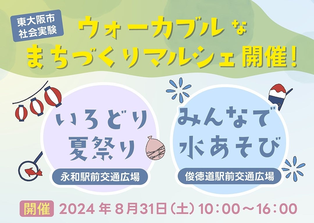 地域活性化を目的とし、東大阪公式観光情報サイト『ピカッと東大阪』を運営する一般社団法人東大阪ツーリズム振興機構(所在地:東大阪市・理事長:高橋一夫)は、快適で魅力あふれる都市空間の創出を目的に、俊徳道駅及び永和駅前交通広場の整備を進めている東大阪市に協力し、子どもからお年寄りまで活用できる多世代交流の場としての利活用や利用者ニーズ、整備した施設の効果や地域イベントの可能性の検証等を行うための社会実験である『ウォーカブルなまちづくりマルシェ』を開催することをお知らせします。本イベントは、駅中心のまちづくりを目指し、民間事業者(EN(えん)・一般社団法人irodori.)と連携の上実施します。