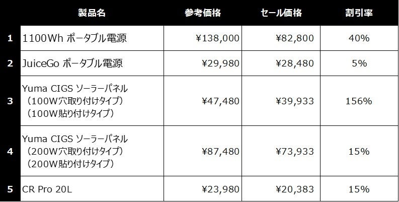 この度のセール対象製品を一部ご紹介します。ポータブル電源やソーラーパネルは、防災アイテムとして便利な製品となっております。