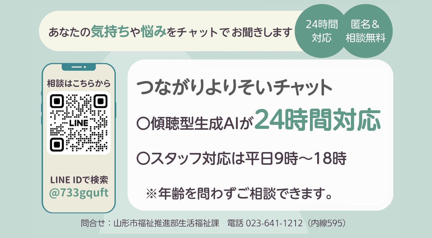 山形市では、24時間対応できる傾聴型生成AIと専門職の相談員のどちらに相談するかを選べるハイブリッド型のLINE相談「つながりよりそいチャット」の運用を令和6年7月12日から開始しています。
