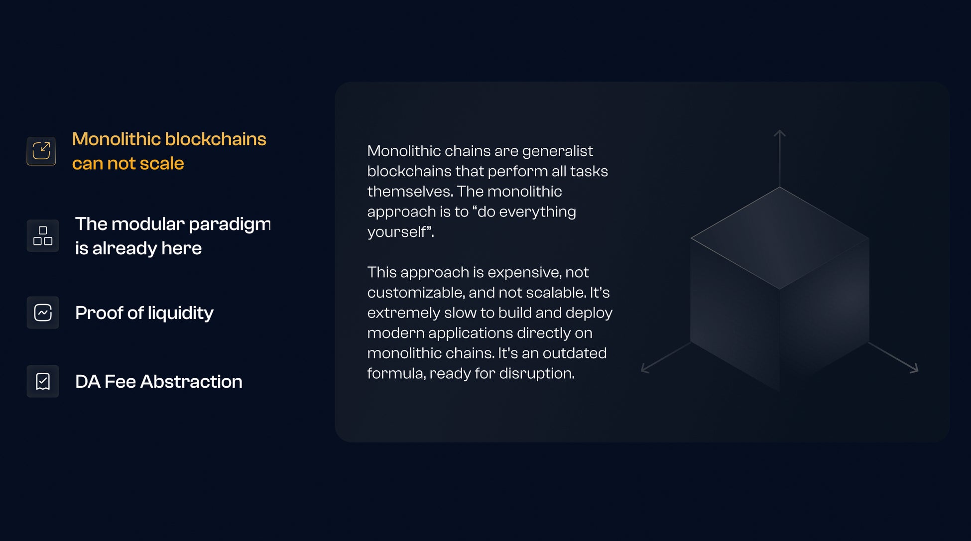 EthereumやBTCのような従来のブロックチェーンは、そのチェーン単体で完結するモノリシック・アーキテクチャを採用しており、「モノリシックブロックチェーン」と呼称します。